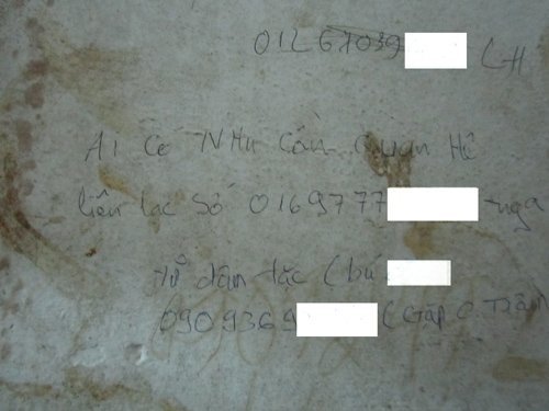 Đa phần, các số điện thoại được ghi nhếch nhác ở những nơi công cộng, đặc biệt là những chỗ kín như nhà vệ sinh bến xe, nơi có nhiều người ra vào. Các số điện thoại này được ghi với những lời chào mời của người đồng giới, gái mại dâm, và không ít người bị hại bởi trò bẩn của kẻ xấu.