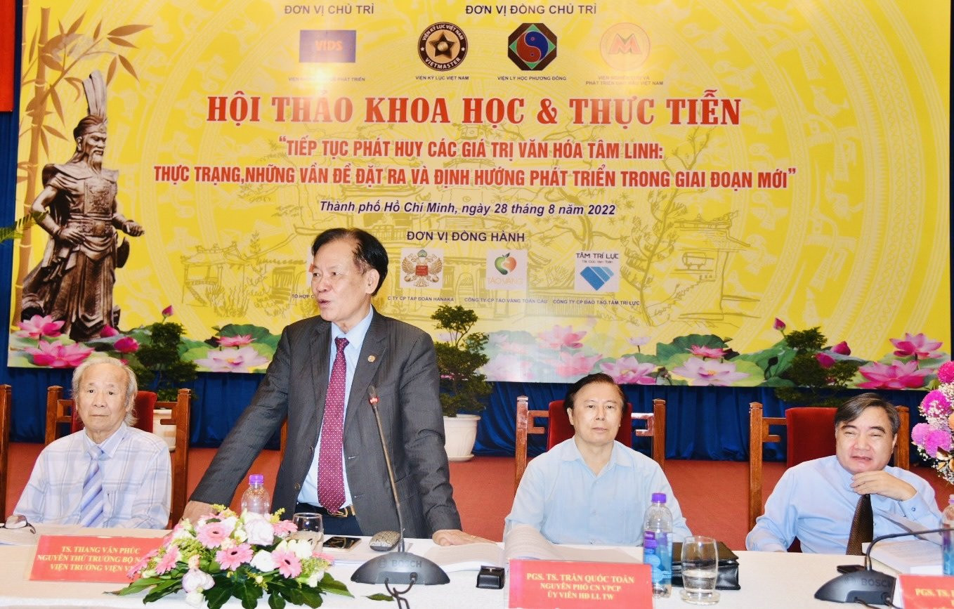 TS. Thang Văn Phúc - nguyên Thứ trưởng Bộ Nội vụ, Chủ tịch VIDS phát biểu, Viện là tổ chức Khoa học phi lợi nhuận, hoạt động trong lĩnh vực Khoa học – Công nghệ, trong đó nhiệm vụ nghiên cứu những vấn đề văn hóa nói chung trong sự phát triển của đất nước và thời đại. Do yêu cầu thực tiễn và tính cấp bách, Viện đã chủ trì và phối hợp các đơn vị liên quan tổ chức hội thảo này nhằm làm rõ hơn, quán triệt sâu sắc hơn tư tưởng chỉ đạo của Đảng, Nhà nước về phát huy và phát triển văn hóa tâm linh, các giá trị văn hóa tâm linh đối với với sự phát triển của đất nước. Đồng thời đánh giá thực trạng văn hóa tâm linh, phát huy các giá trị văn hóa tâm linh; làm rõ các vấn đề đặt ra và đề xuất các giải pháp nhằm phát huy các giá trị tích cực của văn hóa tâm linh, hạn chế các tác động tiêu cực đối với sự phát triển của đất nước.