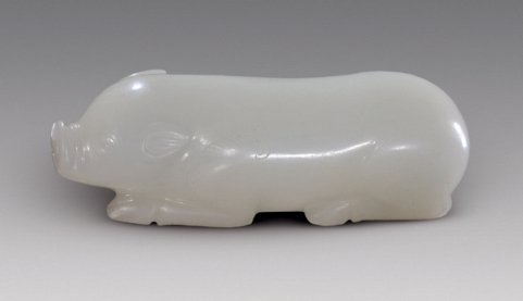 Tượng một chú heo bằng ngọc, mũi hếch lên, trong tư thế như đang ngủ