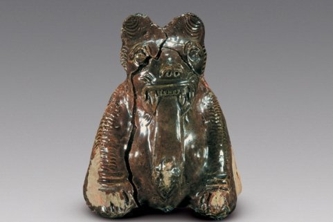 Tượng một vị thần bảo vệ mộ bằng men trông rất đáng sợ với cái cái lưỡi dài thò ra ngoài và có một con vật đang bò trên đầu lưỡi.