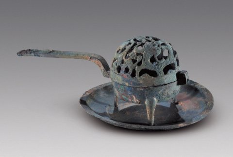 Một lư hương đồng, được trang trí bằng hoa văn hình hoa và cây cối.