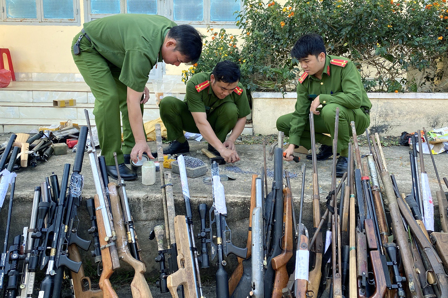Ngày 28/2, Công an huyện Bảo Lâm (Lâm Đồng) tổ chức tiêu hủy 62 khẩu súng hơi và súng tự chế các loại, 21 súng kíp, 14 súng hơi cồn, 13,5kg đạn chì.