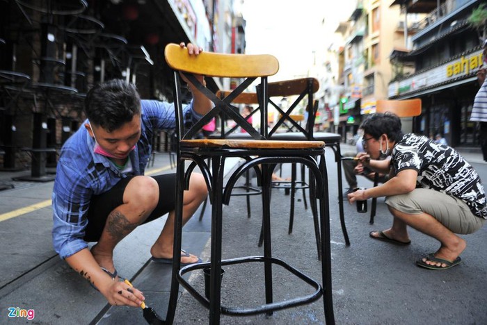 Chiều 22/4, nhiều gian hàng, quán xá của phố tây Bùi Viện nhộn nhịp nhân viên vệ sinh, sơn sửa bàn ghế. Họ mong muốn phố được phép hoạt động trở lại càng sớm càng tốt.