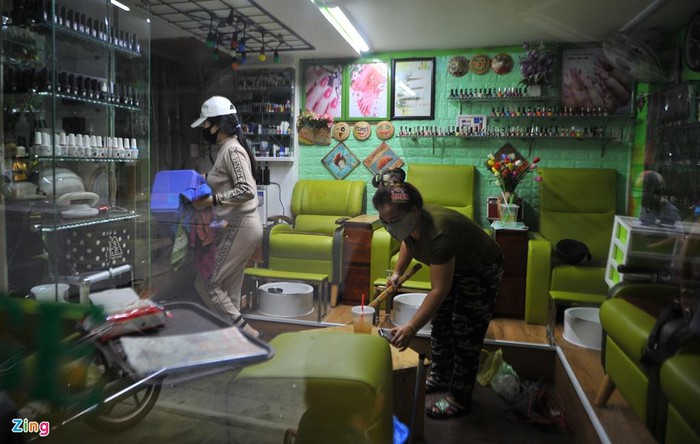 Nhân viên một cửa hiệu nail lau dọn vệ sinh, chuẩn bị bàn ghế, vật dụng... sẵn sàng hoạt động trở lại. Khi được hỏi, chủ tiệm nail nói đã nóng lòng chờ hết lệnh cách ly xã hội từ nhiều ngày qua. Chủ tiệm này cũng mong muốn lãnh đạo thành phố sớm cho phép phố Bùi Viện hoạt động trở lại.