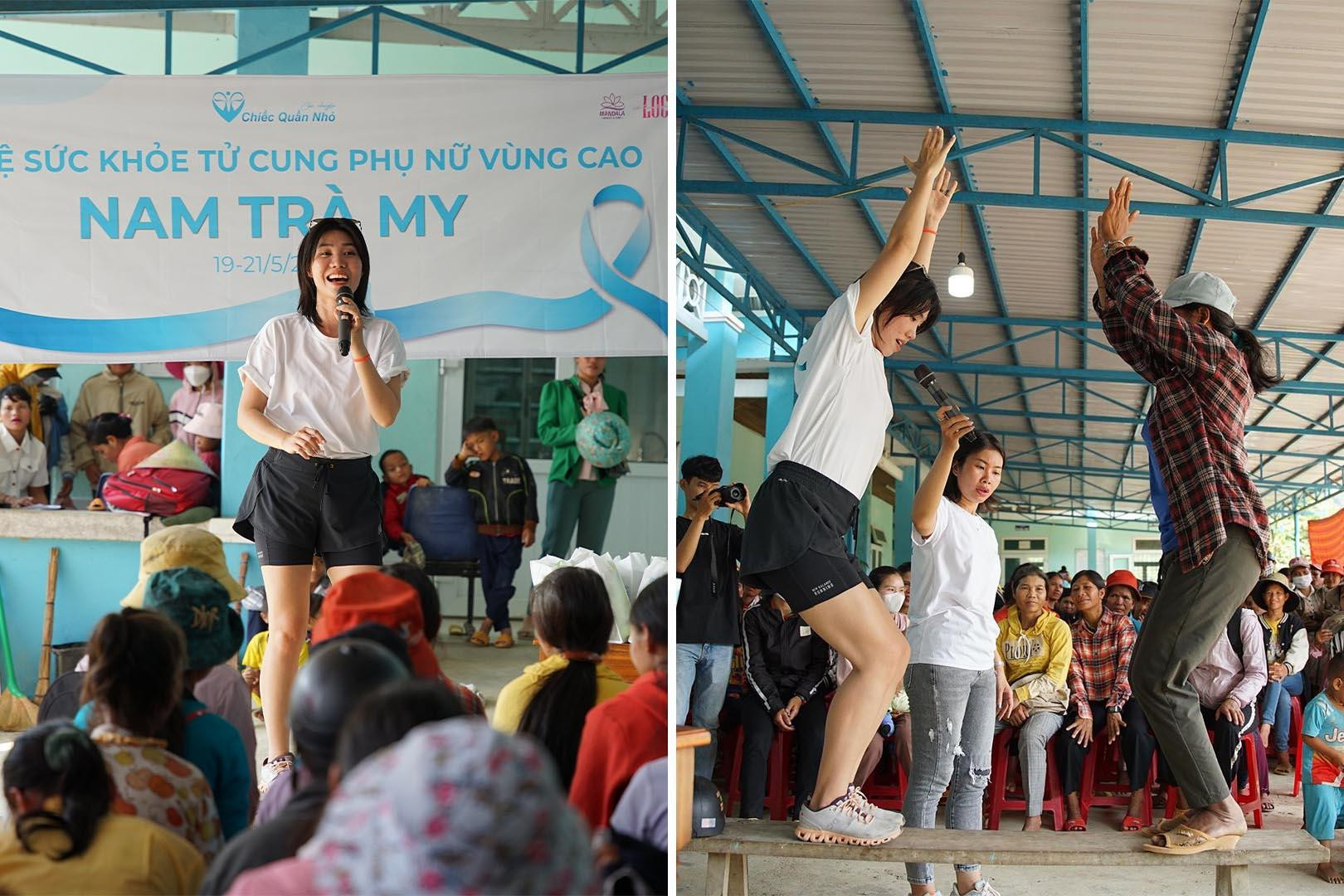 Trà My cùng đội ngũ y, bác sĩ trực tiếp đến địa phương, tiếp cận và khuyến khích tham gia hoạt động. Để sẵn sàng cho buổi giao lưu với bà con, Trà My cùng cả đoàn thiện nguyện đã chuẩn bị kỹ càng những bài tập thực hành sàn chậu và phần chia sẻ kiến thức sức khoẻ sinh sản từ bác sĩ.