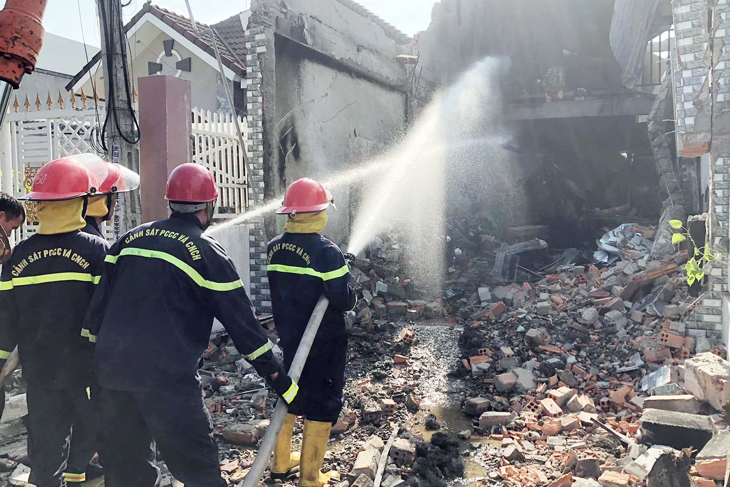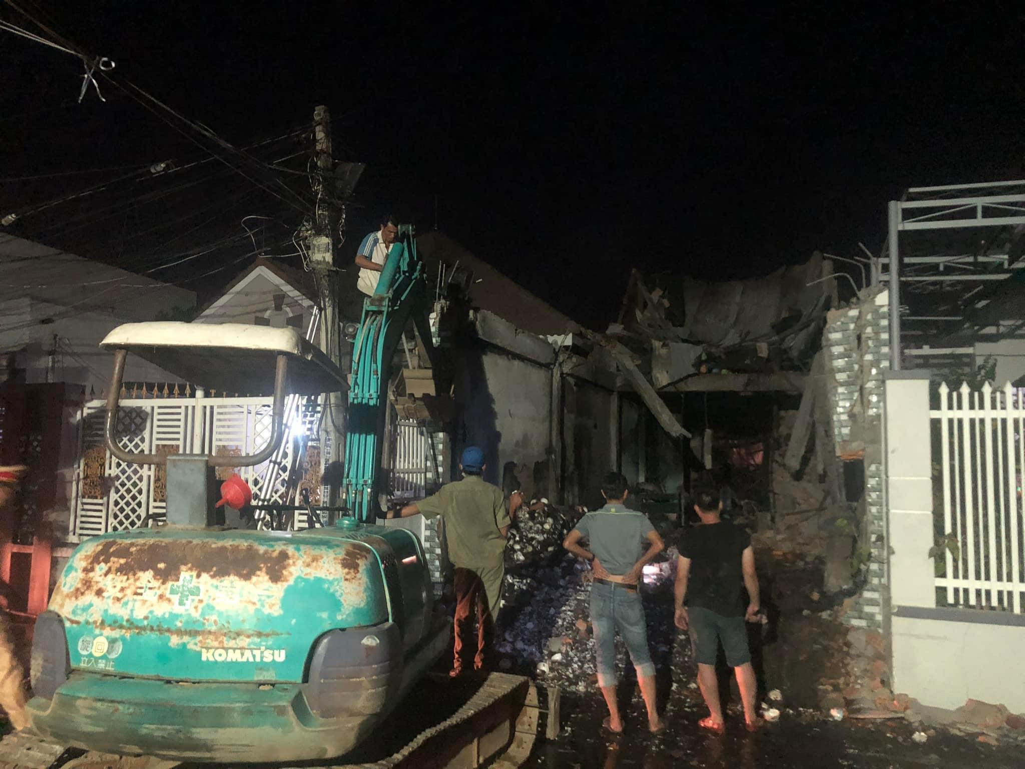 Theo Đại tá Cầm, ngọn lửa đã được khống chế hoàn toàn. Tuy nhiên, hai bức tường của căn nhà này có kết cấu khá yếu, dễ ảnh hưởng đến các nhà xung quanh. Chiều nay, xe múc vào hiện trường, cùng với lực lượng chức năng tiến hành đào bới, làm theo kiểu “cuốn chiếu” từ ngoài vào trong, khơi đống đổ nát, để tìm kiếm dấu tích ba mẹ con bị kẹt bên trong.