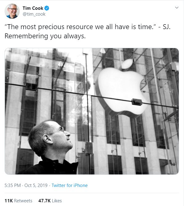 Tim Cook đăng tấm ảnh Jobs chụp tại cửa hàng Apple Store Fifth Avanue tại New York (Mỹ), trích dẫn câu nói của Jobs mà ông tâm đắc: “Tài nguyên quý giá nhất của chúng ta là thời gian”. Người đứng đầu Apple bày tỏ “luôn nhớ tới ông”.
