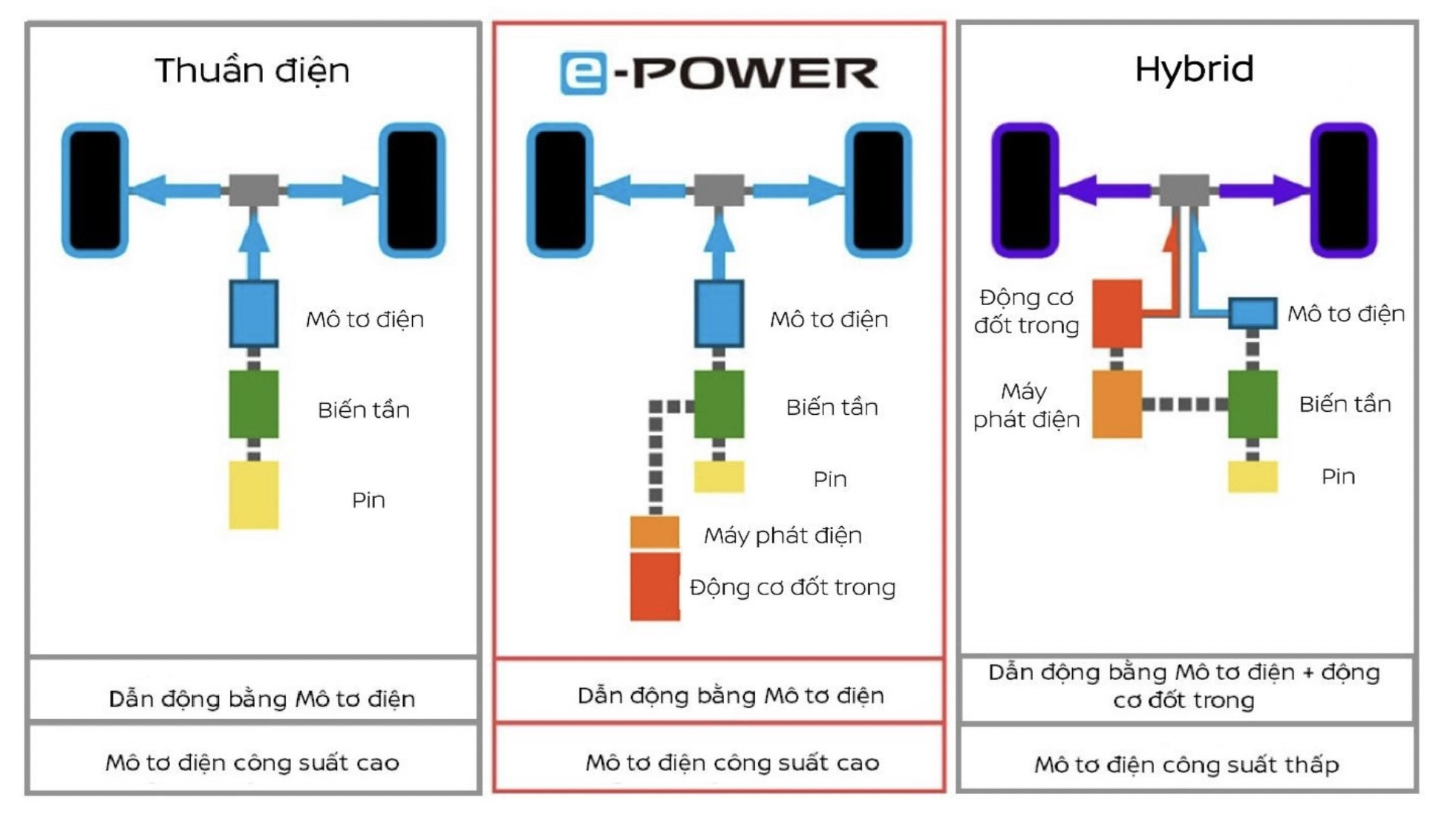 Theo đó, động cơ điện với công suất tối đa 134 mã lực và momen xoắn cực đại 280 Nm, đóng vai trò chính trong vận hành xe. Trong khi ở các hệ thống hybrid thông thường, các bánh xe được dẫn động bằng cả mô tơ điện và động cơ xăng. Thì với công nghệ e-Power, các bánh xe được dẫn động 100% thông qua mô tơ điện công suất cao chứ không sử dụng sức kéo từ động cơ xăng.
