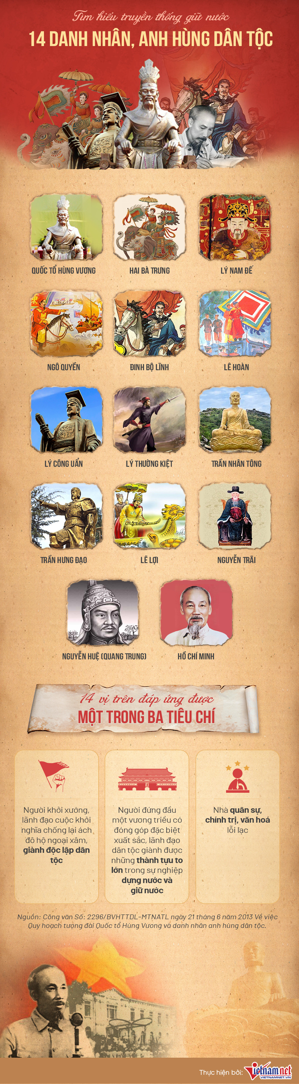 LTS: Theo Công văn ngày 21/6/2013, của Bộ Văn hóa, Thể Thao và Du lịch, danh sách 14 vị anh hùng tiêu biểu của dân tộc Việt Nam xếp theo thứ tự thời gian bao gồm: Quốc tổ Hùng Vương, Hai Bà Trưng, Lý Nam Đế, Ngô Quyền, Đinh Bộ Lĩnh, Lê Hoàn, Lý Công Uẩn, Lý Thường Kiệt, Trần Nhân Tông, Trần Hưng Đạo, Lê Lợi, Nguyễn Trãi, Nguyễn Huệ (Quang Trung), Chủ tịch Hồ Chí Minh.