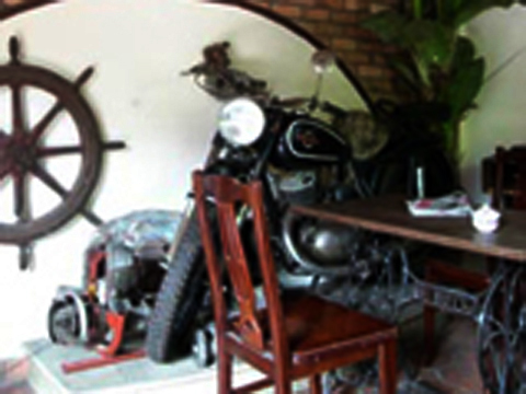 Bước vào Xe Cổ Quán, người ta như lạc vào phòng khách sang trọng của một gia đình quý tộc thời xưa với không khí hoài cổ, lắng đọng, phủ mờ bụi thời gian. Nét độc đáo nhất ở đây vẫn là các chân bàn được làm bởi chân máy khâu hiệu Singer, trên tường có gắn chiếc Solex thanh mảnh, phía xa nơi góc tường chiếc điện thoại “không dây” nhưng vẫn kết nối bình thường. Một góc khác, chiếc quạt nhãn hiệu Marelli nhuốm màu thời gian nằm ngay ngắn, tiếp đó chiếc máy hát với chiếc loa hình hoa loa kèn chỉ hay xuất hiện trong những bộ phim cổ trang.