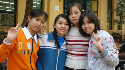Em Nguyễn Thị Nhung (ngồi phía trong) được trường Hoa Sữa tiếp nhận