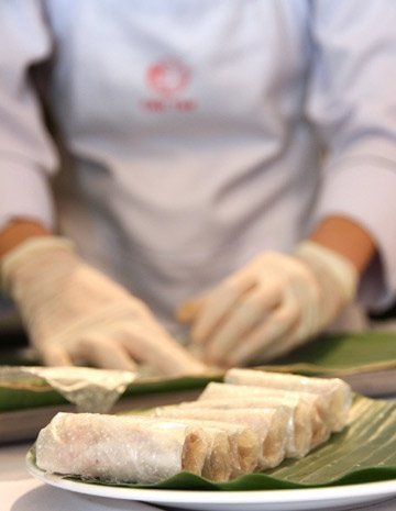 Giò lụa, từ trong ra ngoài đều phải tươi, từ thịt heo tươi đến mức cơ thịt còn động đậy tới lá chuối tươi xanh gói ở ngoài. Còn chả giò chẳng khác gì một thế giới tươi non thu nhỏ: tôm, thịt, rau củ tươi phối trộn hài hòa.
