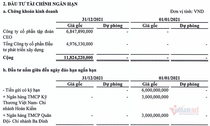 Tính tới 31/12/2021, công ty đang có khoản đầu tư vào chứng khoán và gửi tiền ngân hàng. Chứng khoán kinh doanh vào CTCP tập đoàn CEO là hơn 6,8 tỷ đồng và TCTCP đầu tư phát triển xây dựng trên 4,9 tỷ đồng. Số tiền gửi ngân hàng theo kỳ hạn là 6 tỷ đồng.
