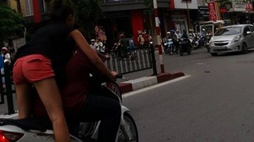 Cô gái vừa đứng sau điều khiển chiếc xe máy, vừa "hôn hít" bạn trai mình giữa phố Hà Nội.