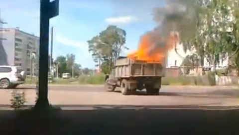 Chiếc xe tải với lửa cháy rừng rực trên thùng xe lao băng băng trên đường phố Nga trong khi tài xế không hề hay biết.