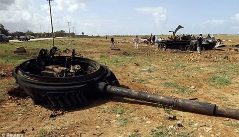 Tháp pháo của một xe tăng bên ngoài Benghazi bị thổi tung sau một vụ tấn công Tomahawk của liên quân. (Ảnh: Reuters)