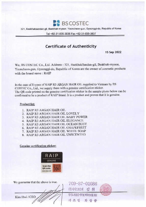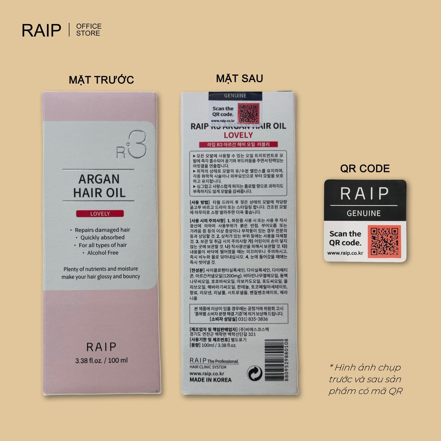 Để khách hàng lựa chọn được sản phẩm chính hãng, tránh mua phải sản phẩm không đúng với chất lượng của nhà sản xuất, khách hàng nên kiểm tra kỹ sản phẩm trước khi mua. Sản phẩm Argan Raip R3 được bán ra thị trường luôn có tem phụ nhận biết và kèm theo mã QR (màu đỏ) đính trên sản phẩm. Khi check vào mã QR khách hàng sẽ được liên kết trực tiếp với trang website chính thức của RAIP tại Hàn Quốc. Phần màu của tem có thể thay đổi vào từng thời điểm, khi đó hãng sẽ có thông báo chính thức liên quan. Cảnh báo người dùng tại Việt Nam đối với những sản phẩm không có tem phụ hoặc mã QR có thể là hàng giả, hàng nhái sản phẩm.