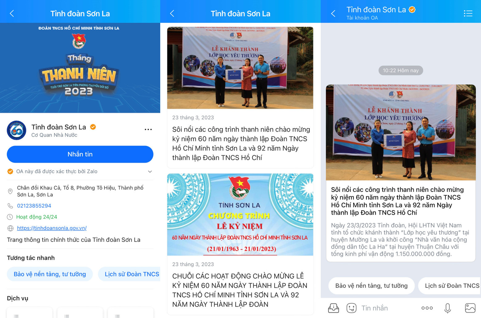 Chia sẻ về lý do lựa chọn nền tảng Zalo cho công trình số, Tỉnh đoàn Sơn La đánh giá cao những ưu điểm của Zalo với nhiều chức năng phù hợp, hữu ích, dễ dùng và được đa số đoàn viên, thanh niên tỉnh nhà sử dụng. “Đây là một trong những giải pháp hiệu quả, tiết kiệm, góp phần nâng cao hiệu quả công tác tuyên truyền, đa dạng hóa các kênh truyền thông của các cấp bộ đoàn, giúp chúng tôi kịp thời định hướng cho đoàn viên, thanh niên và người dân”, anh Nguyễn Tuấn Anh - Phó Bí thư Tỉnh đoàn, Chủ tịch Hội đồng Đội tỉnh, Chủ tịch Hội sinh viên Việt Nam tỉnh Sơn La cho biết.
