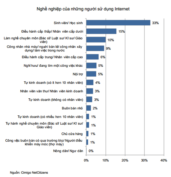 Theo trình độ học vấn và nghề nghiệp, khoảng 54% số người sử dụng Internet có trình độ Cao đẳng, đại học trở lên. Ở các đô thị lớn, số lượng người sử dụng Internet có trình độ học vấn cao hơn so với các địa phương khác. Một phần ba số người sử dụng Internet là sinh viên học sinh. Nhìn chung, 70% người sử dụng Internet là bộ phận trí thức, nhân viên văn phòng, còn lại là công nhân, nội trợ, tiểu thương buôn bán nhỏ, chủ cửa hàng…