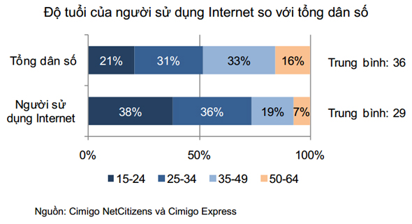 Theo báo cáo của NetCitzens Việt Nam, độ tuổi trung bình sử dụng Internet tại Việt Nam là 29, thấp hơn độ tuổi trung bình của dân số là 36. Chỉ có khoảng 25% người dùng Internet trên 35 tuổi. Số lượng người cao tuổi sử dụng Internet rất thấp, chỉ đạt khoảng 2 triệu người.
