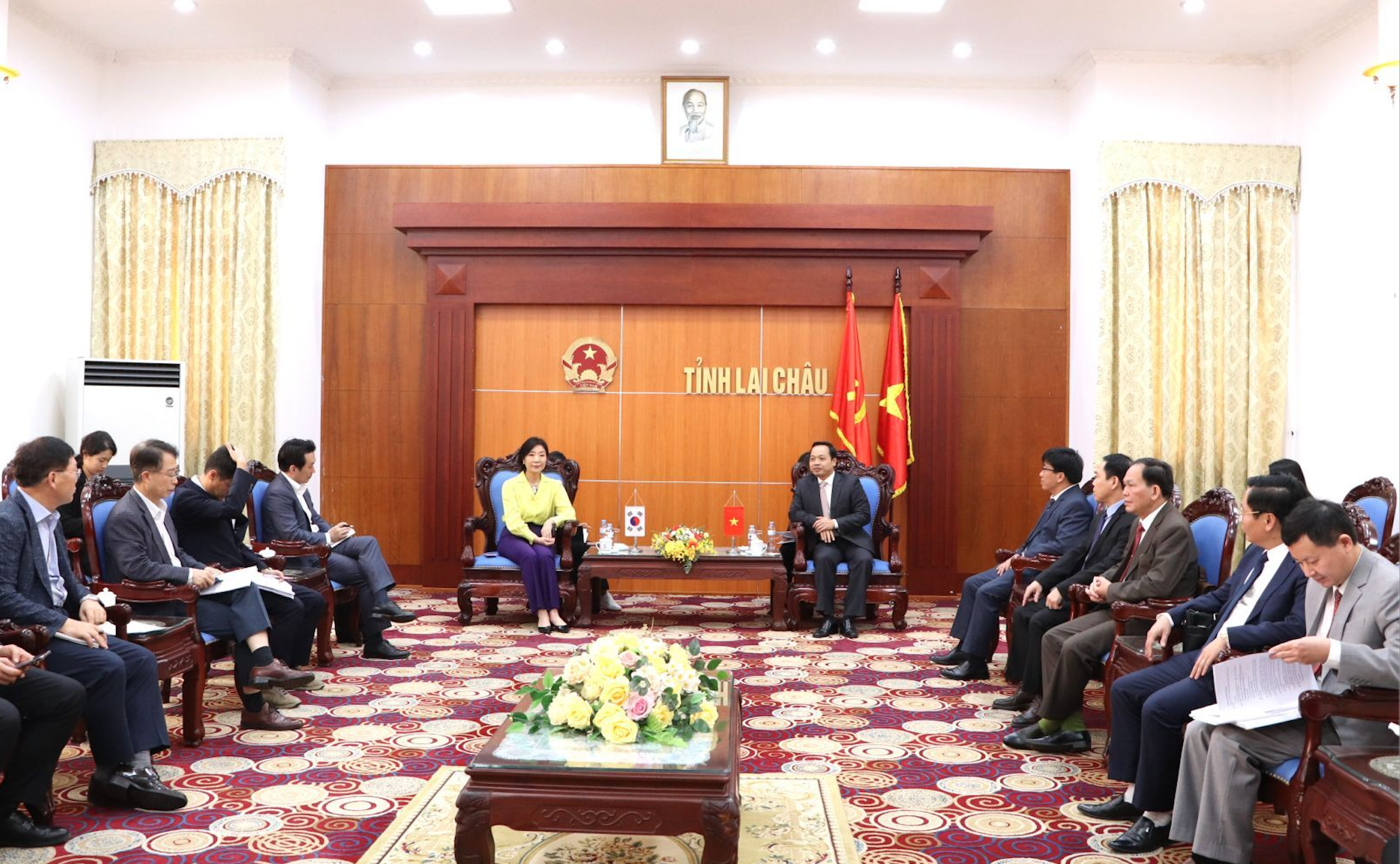 Tỉnh Lai Châu cũng trân trọng đề nghị các thành viên trong Đoàn công tác đến từ Cơ quan hợp tác quốc tế Hàn Quốc (KOICA), Cơ quan xúc tiến Thương mại và Đầu tư Hàn Quốc (KOTRA) và các doanh nghiệp của Hàn Quốc sẽ có các hoạt động hỗ trợ cho tỉnh Lai Châu thông qua các chương trình, dự án tập trung vào các lĩnh vực còn gặp nhiều khó khăn của tỉnh như y tế, giáo dục, những lĩnh vực tỉnh có tiềm năng, thế mạnh như nông nghiệp, du lịch, xuất khẩu lao động, tích cực hỗ trợ, kết nối các doanh nghiệp Hàn Quốc lên khảo sát, đầu tư tại Lai Châu, kết nối để hai Bên hợp tác thương mại, xuất khẩu các mặt hàng nông sản của tỉnh Lai Châu sang thị trường Hàn Quốc.