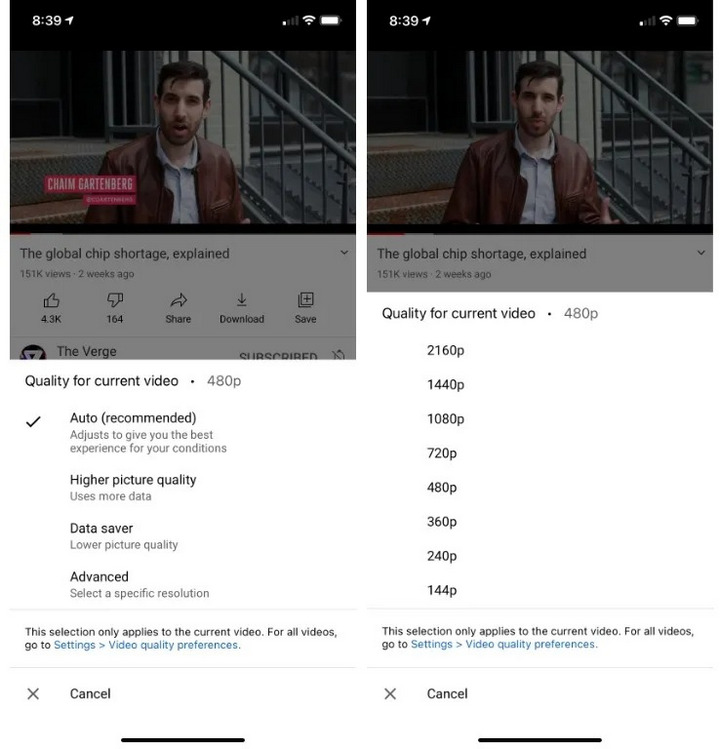 Tất nhiên, tính năng tự động chọn độ phân giải vẫn hữu ích nhất đối với hầu hết mọi người vì nó sẽ tự động chọn cài đặt lý tưởng dựa trên từng hoàn cảnh khác nhau. Bạn sẽ có thể truy cập menu cài đặt video mới trên thiết bị di động ngay từ bây giờ nhưng tất nhiên bạn cần cập nhật ứng dụng trước qua App Store và Play Store.
