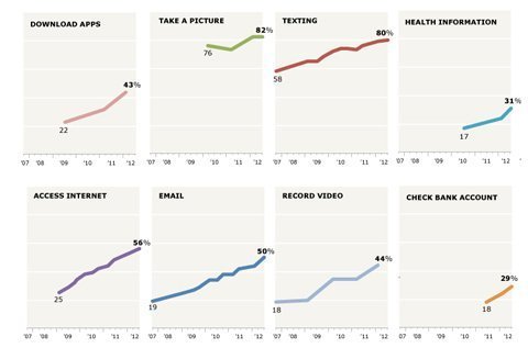 Ngoài ra, có 43% người dùng ĐTDĐ cài đặt ứng dụng trên điện thoại, gần gấp đôi mức 22% năm 2009. 31% dùng điện thoại để tìm hiểu các vấn đề về sức khoẻ. Tính năng được ít dùng nhất là giao dịch ngân hàng qua di động (mobile banking) với chỉ 29% sử dụng.