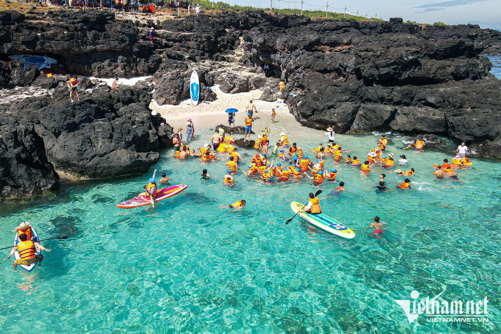 Ngoài tắm mình ở bãi biển trong xanh, du khách có thể trải nghiệm chèo SUP, thuyền kayak, thuyền thúng, lặn biển ngắm san hô...