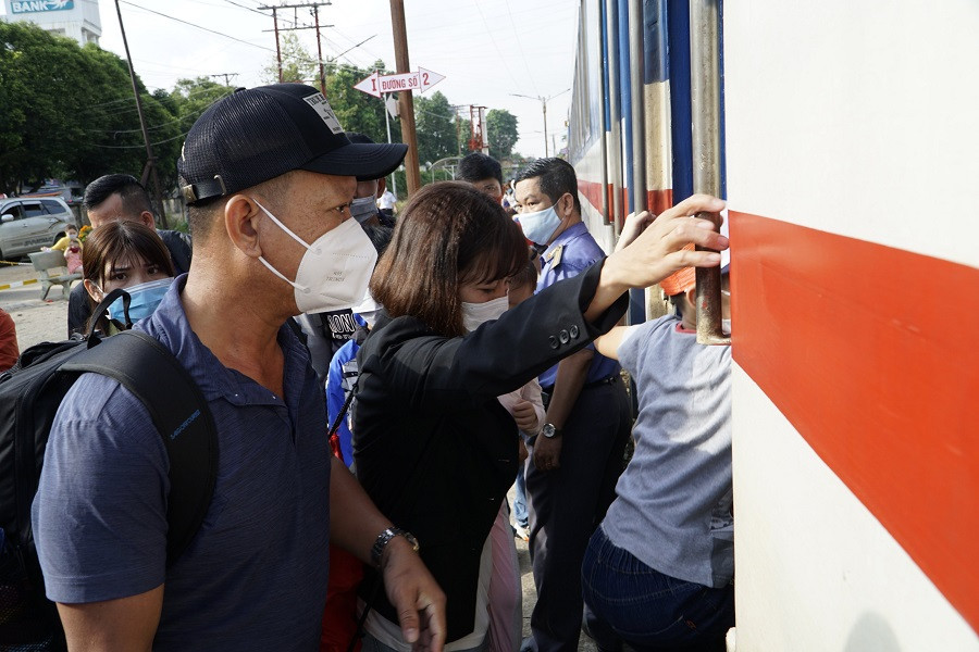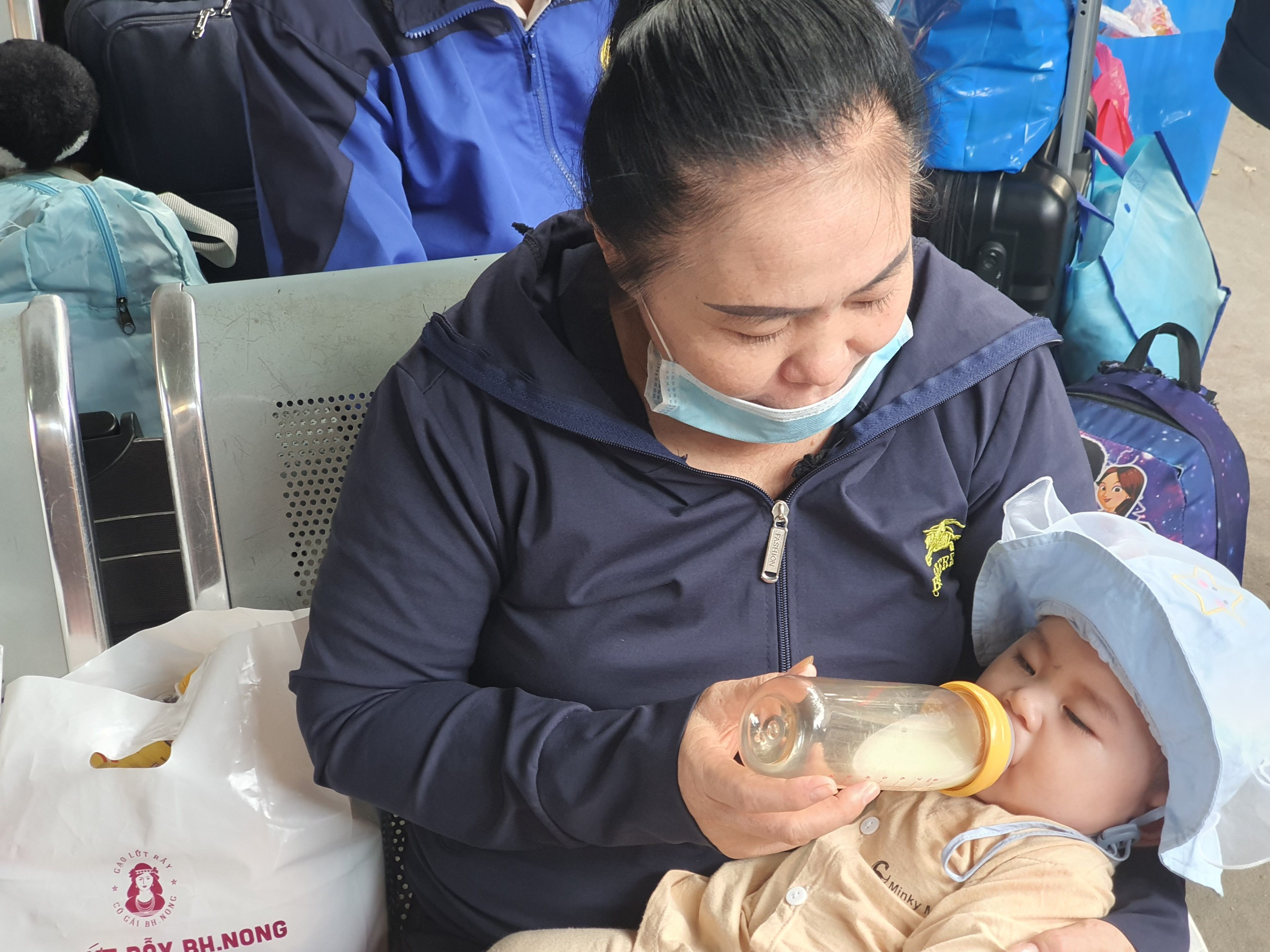 Ngồi lặng lẽ một góc bên nhà ga cùng đứa cháu nội 5 tuổi, bà Nguyễn Thị Tuân, quê tỉnh Hà Tĩnh, làm tạp vụ tại Công ty Đại Lộc (xã An Điền, thị xã Bến Cát) bồn chồn mỗi khi nghe tiếng còi tàu hụ vang từ xa.