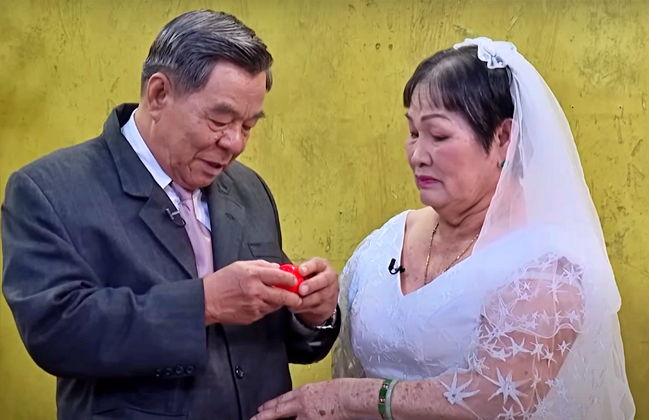 Sau ít phút lắng đọng cảm xúc, ông Hùng đeo nhẫn cưới, tặng vợ sợi dây chuyền, điều ông chưa làm được suốt 48 năm qua. Bà Liên trong trang phục áo cưới hạnh phúc đón nhận những món quà của chồng trong niềm xúc động dâng trào.