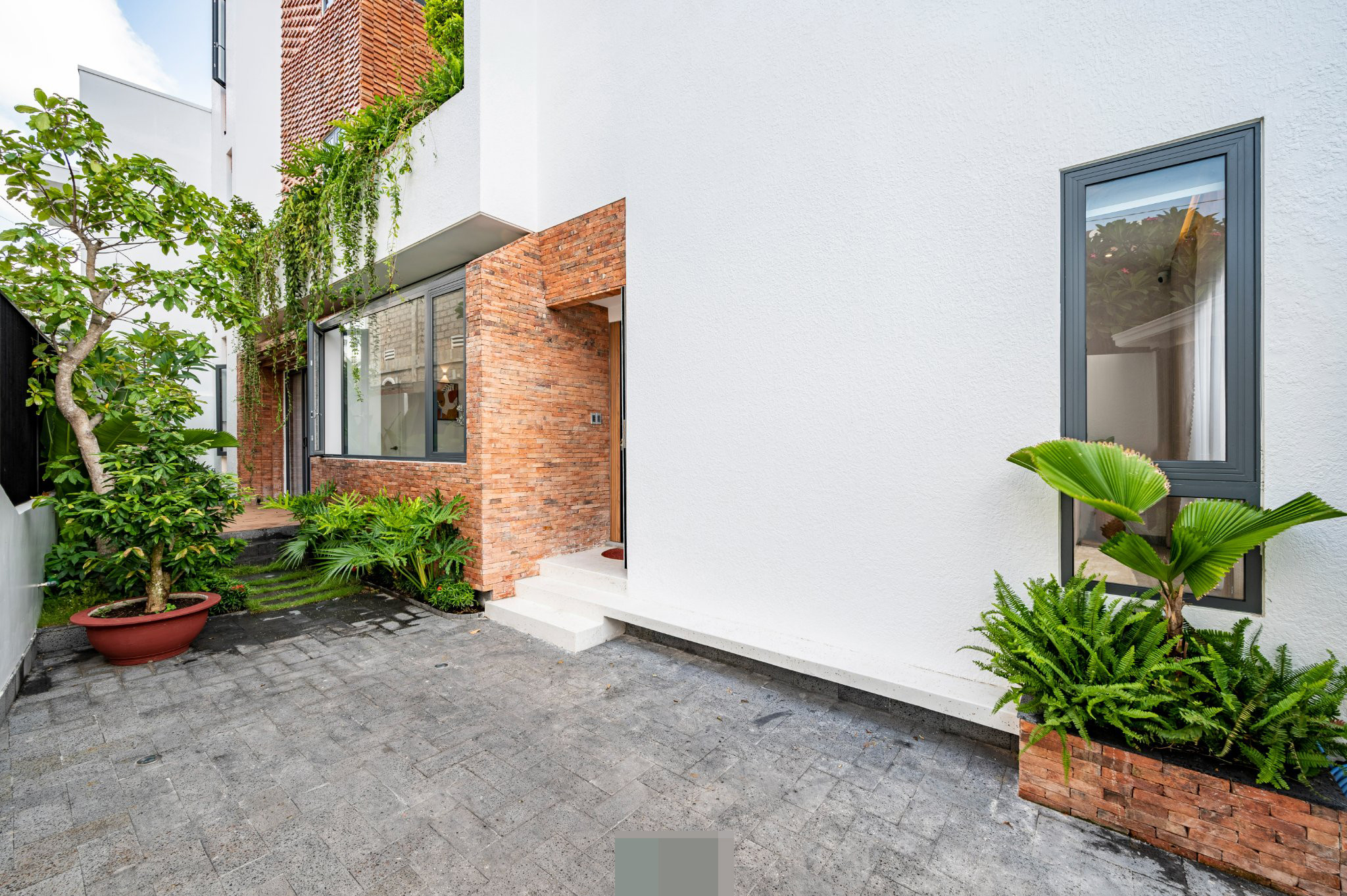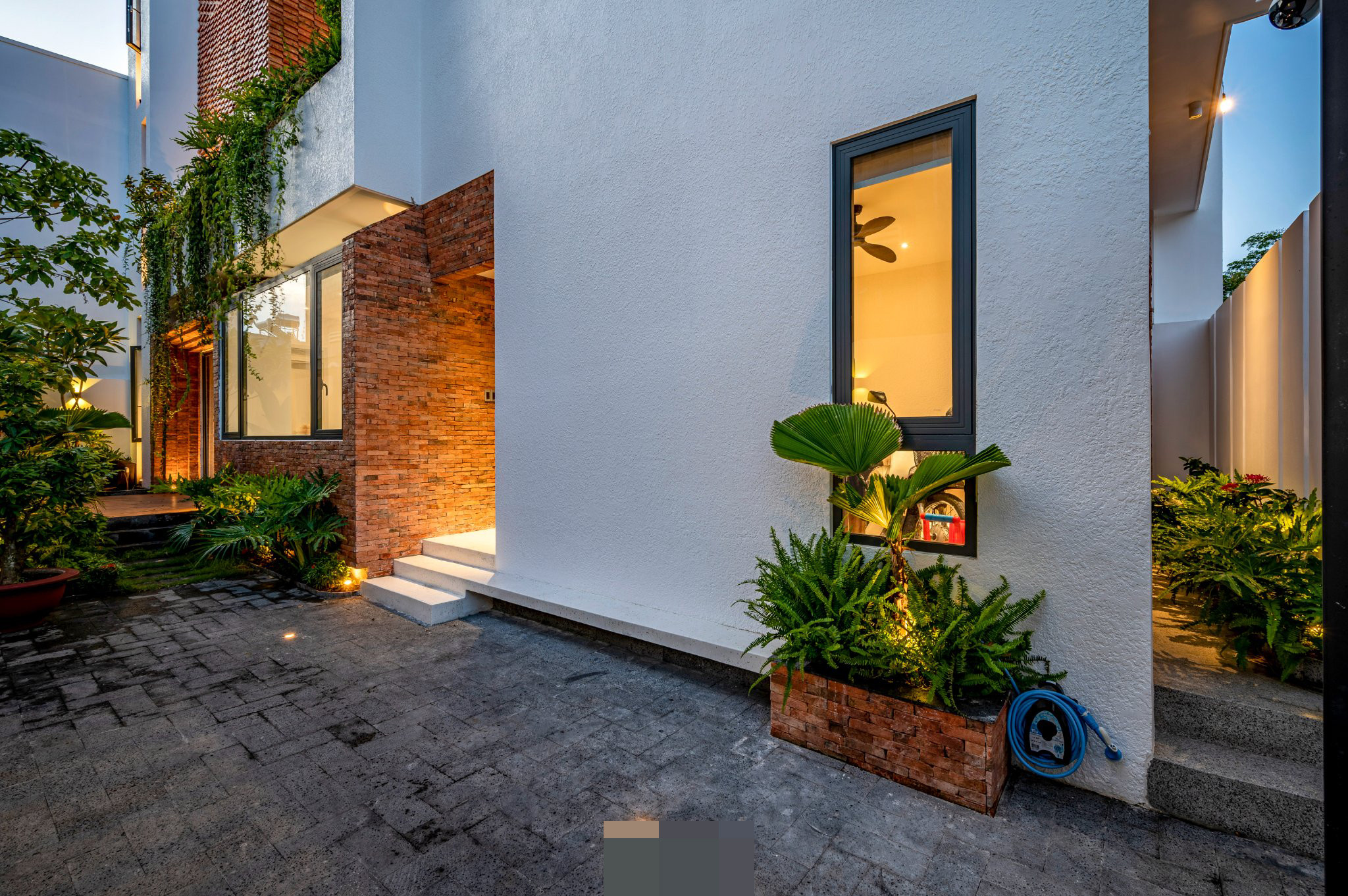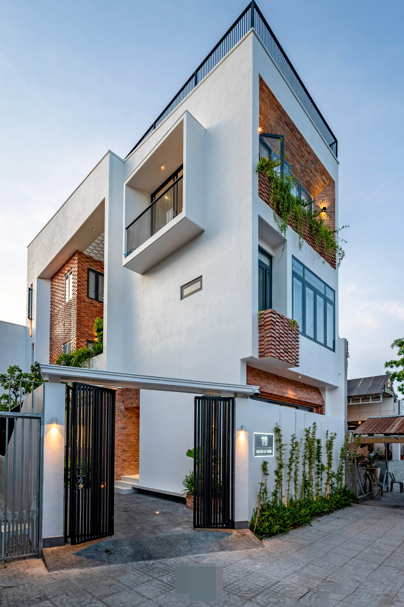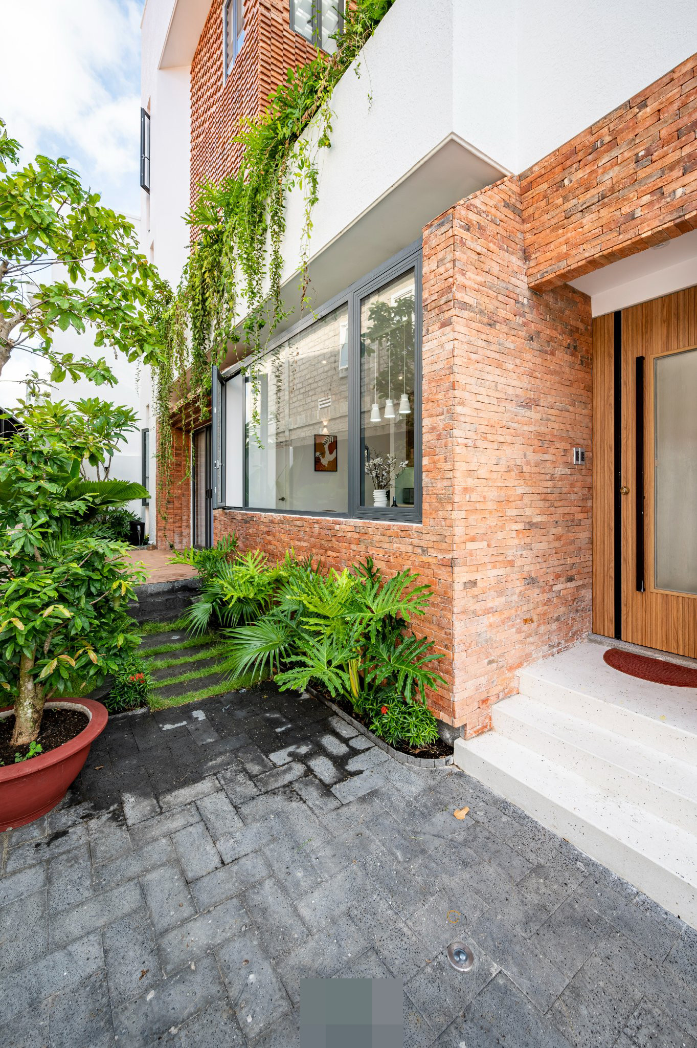 Ngôi nhà có hình khối hiện đại, sơn trắng đan xen các mảng tường gạch nung đỏ hoài cổ.