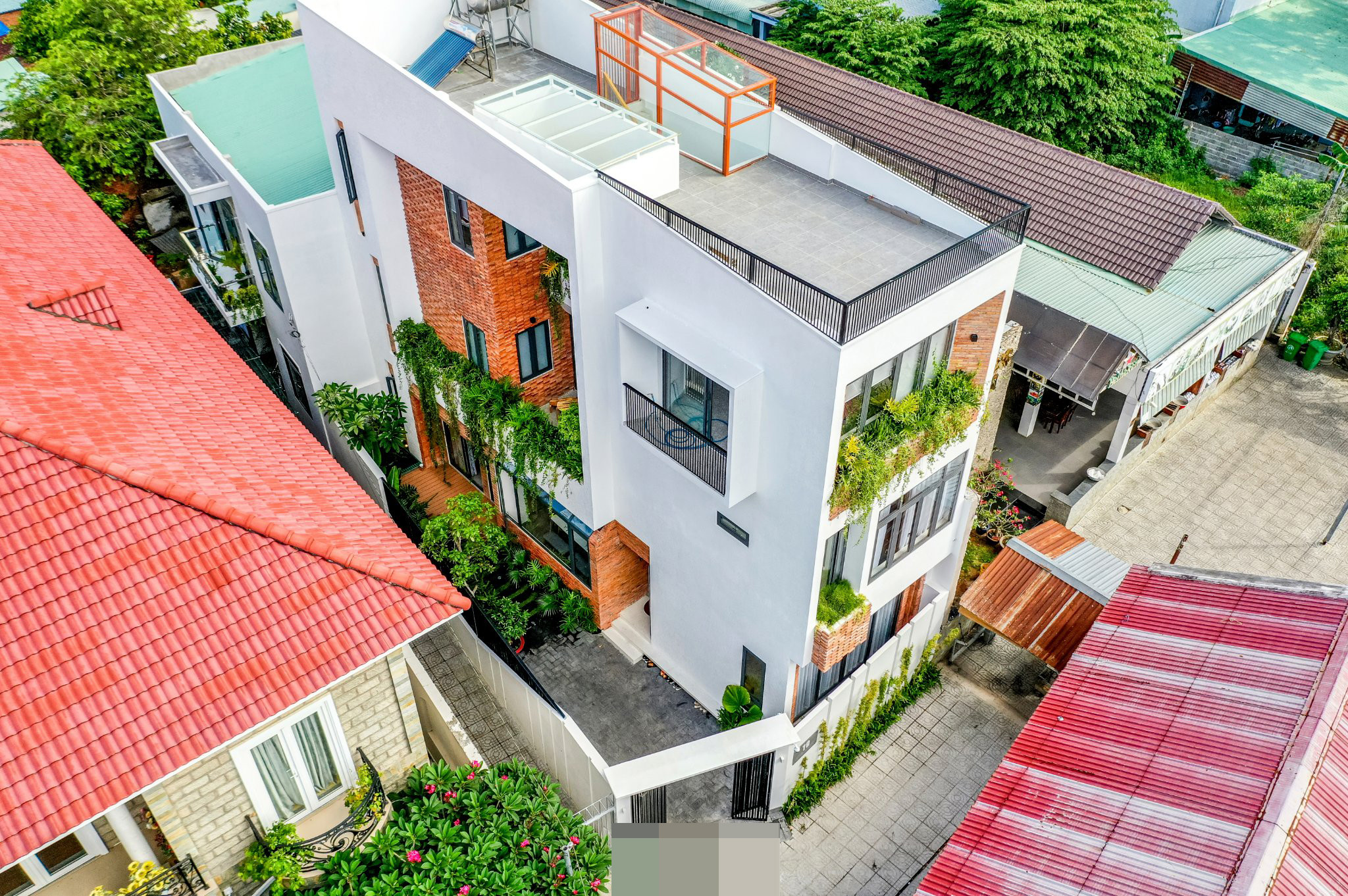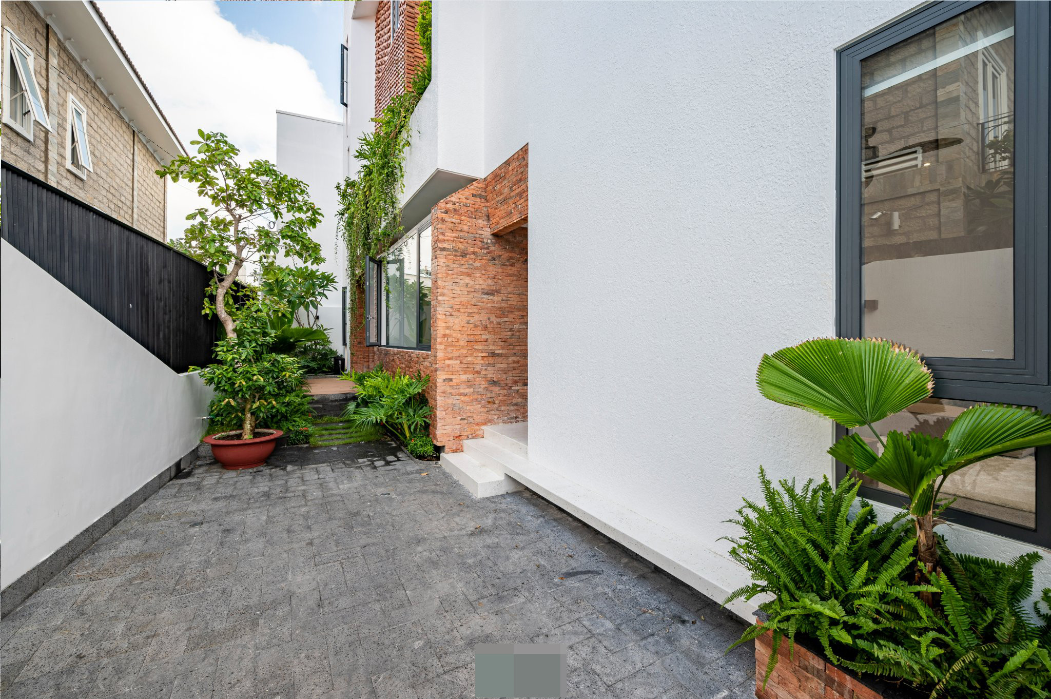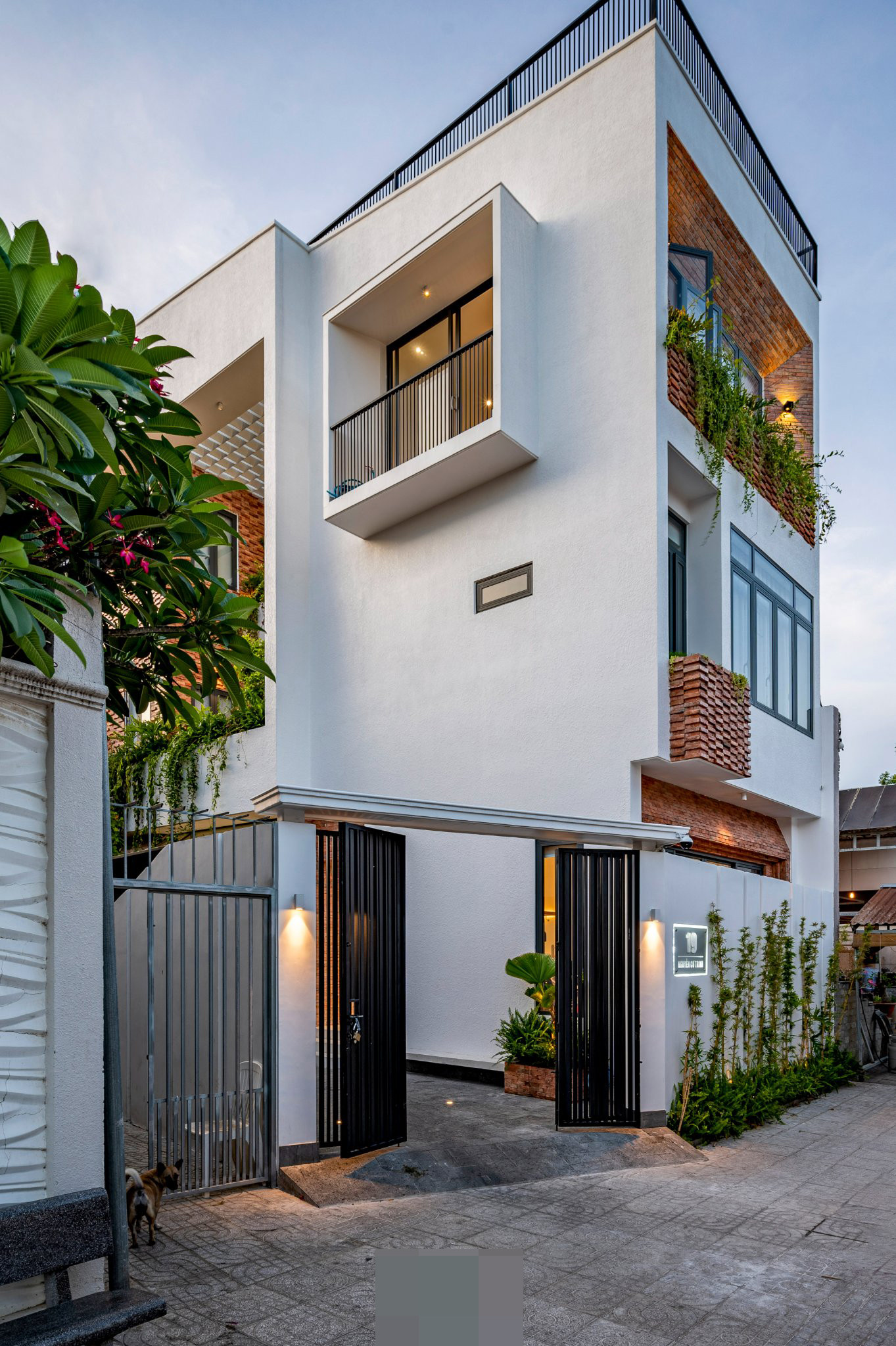 Ngôi nhà có hình khối hiện đại, sơn trắng đan xen các mảng tường gạch nung đỏ hoài cổ.