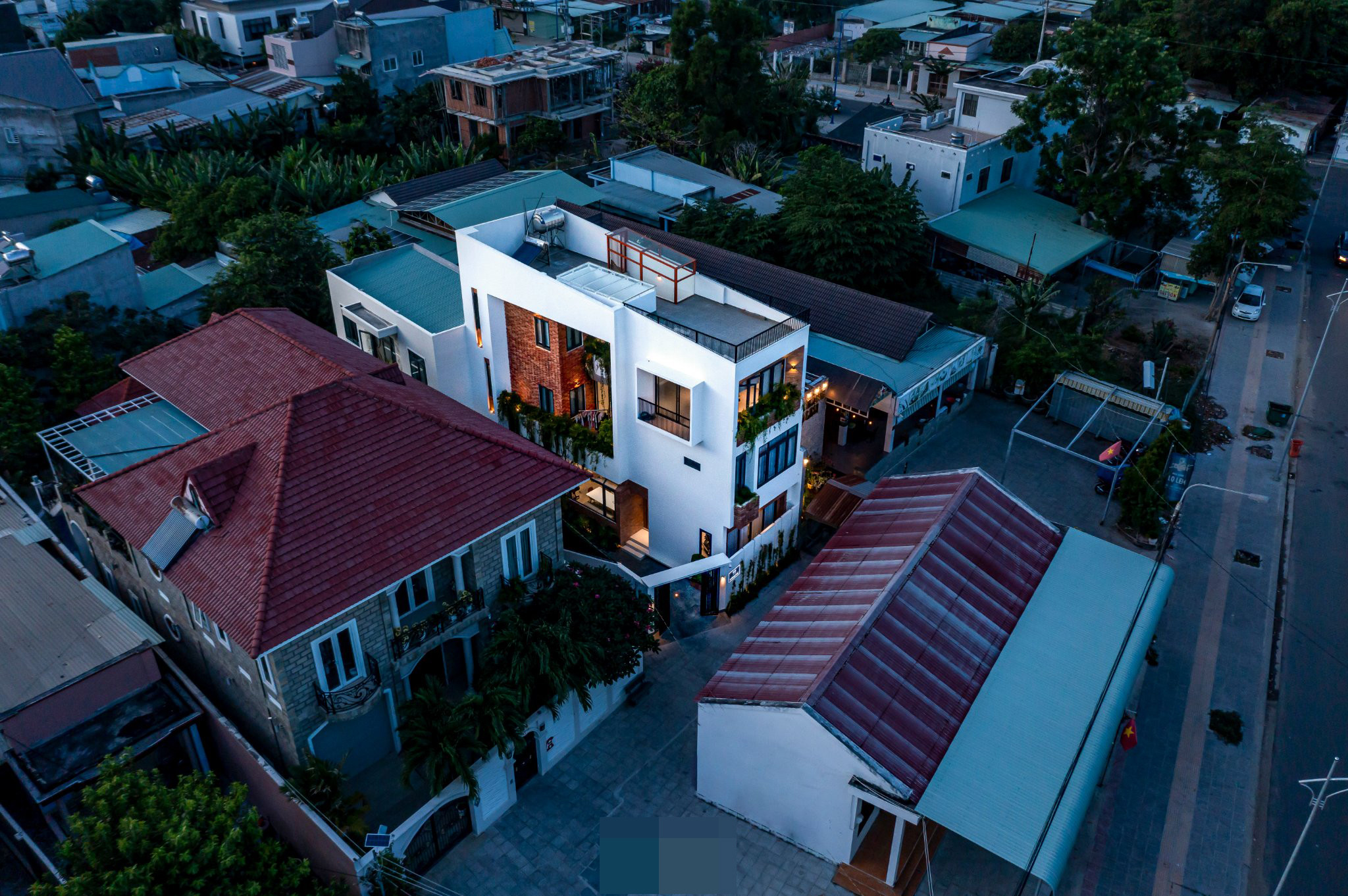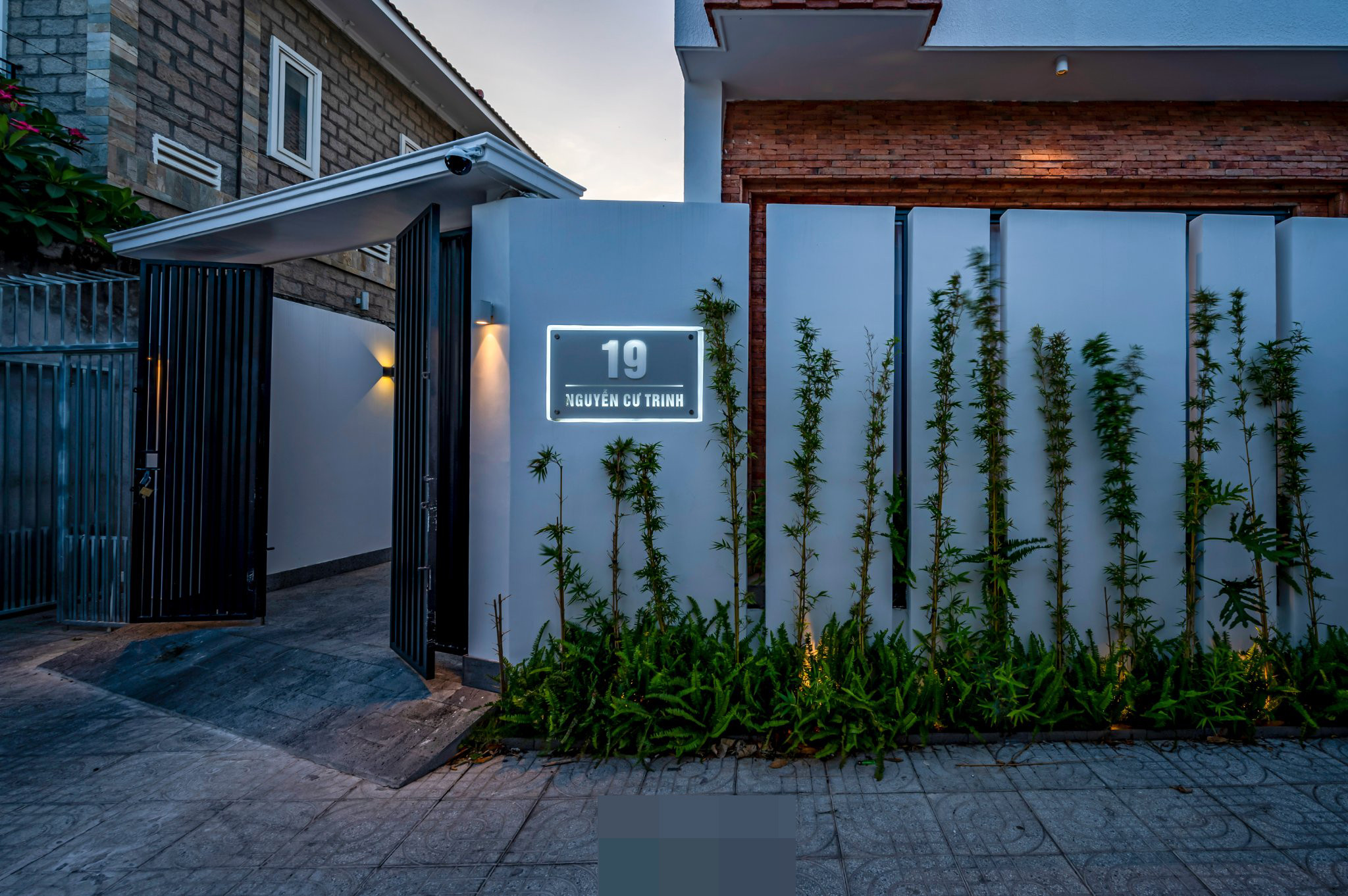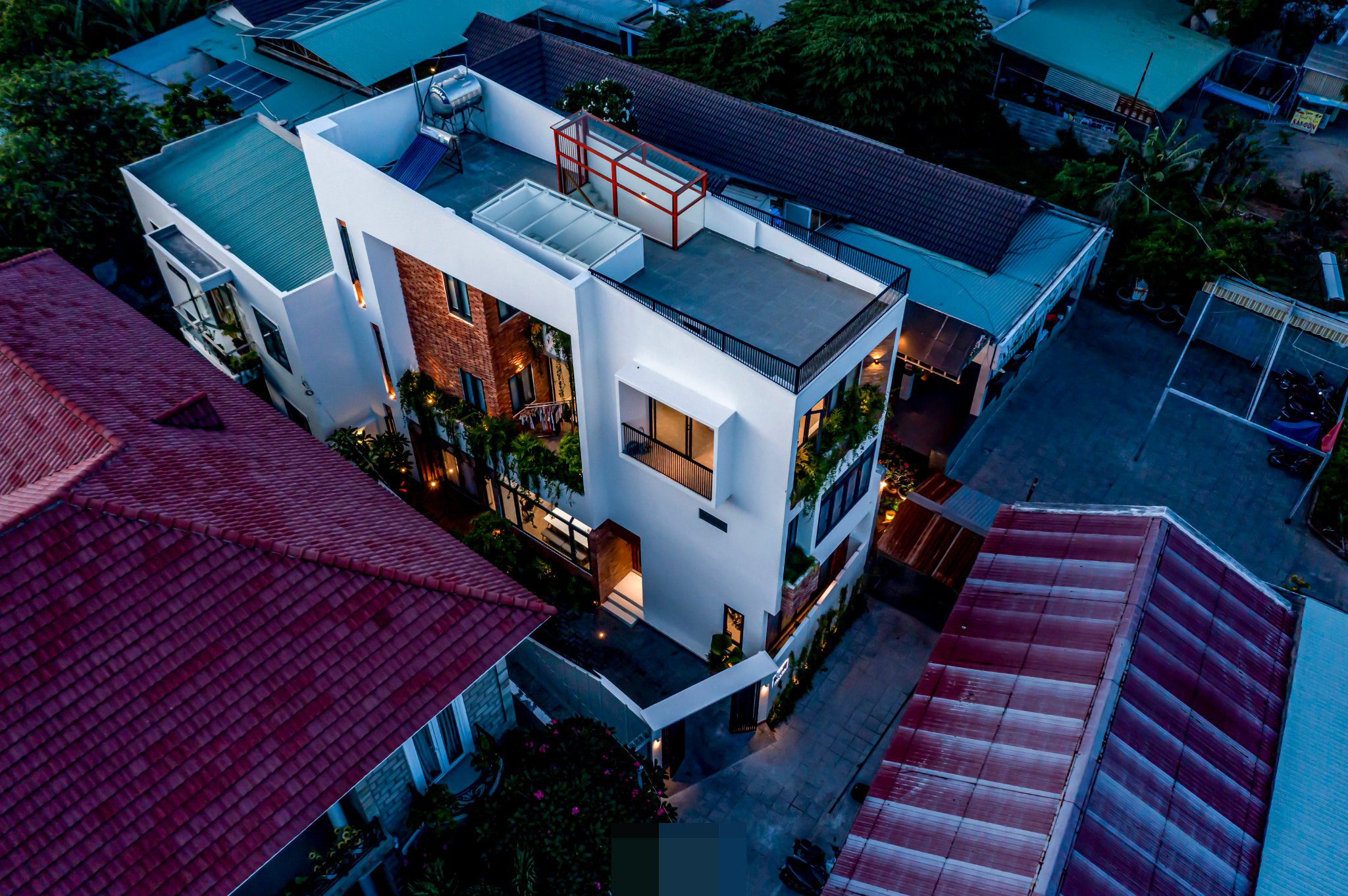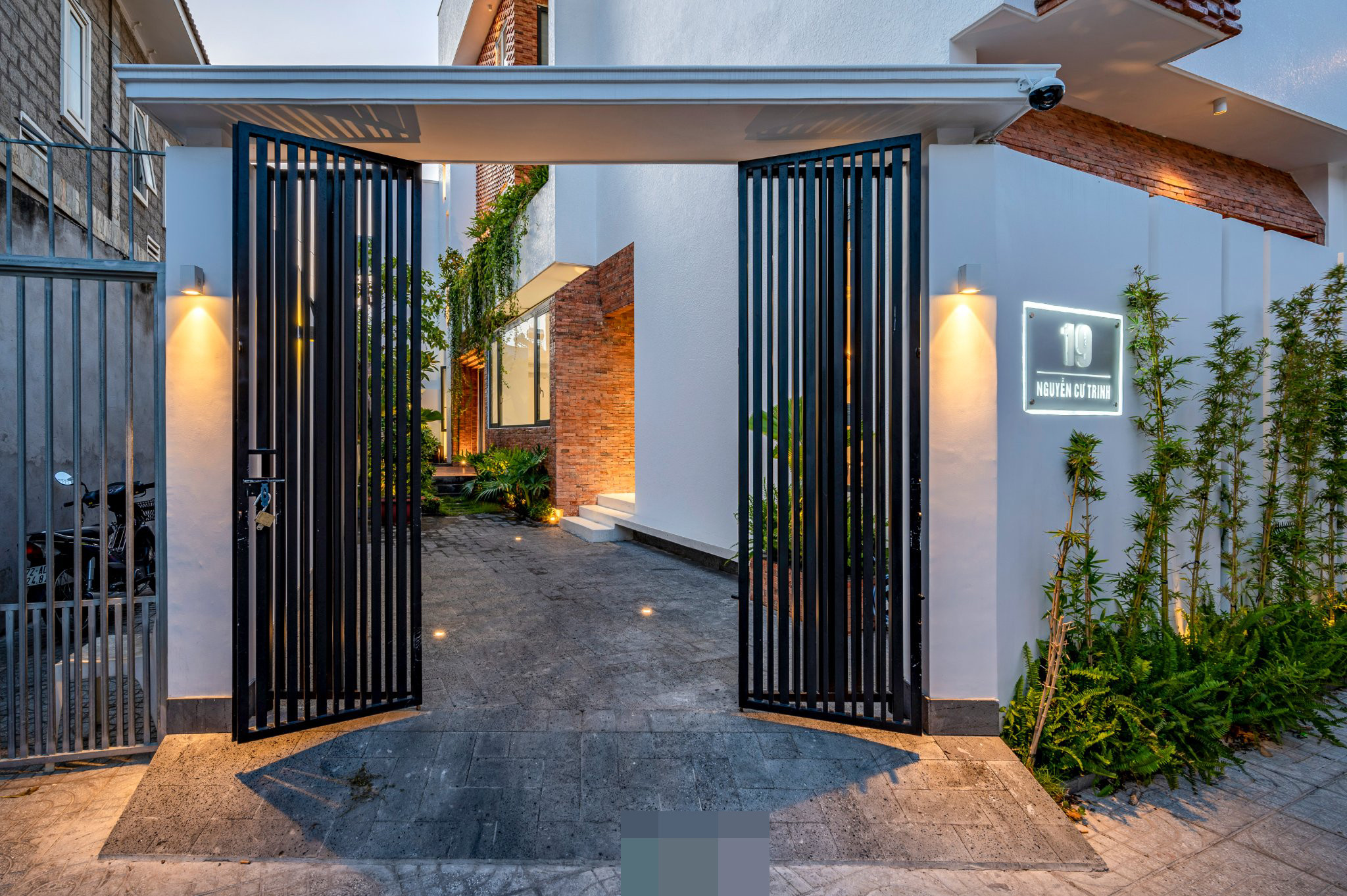 Ngôi nhà có hình khối hiện đại, sơn trắng đan xen các mảng tường gạch nung đỏ hoài cổ.