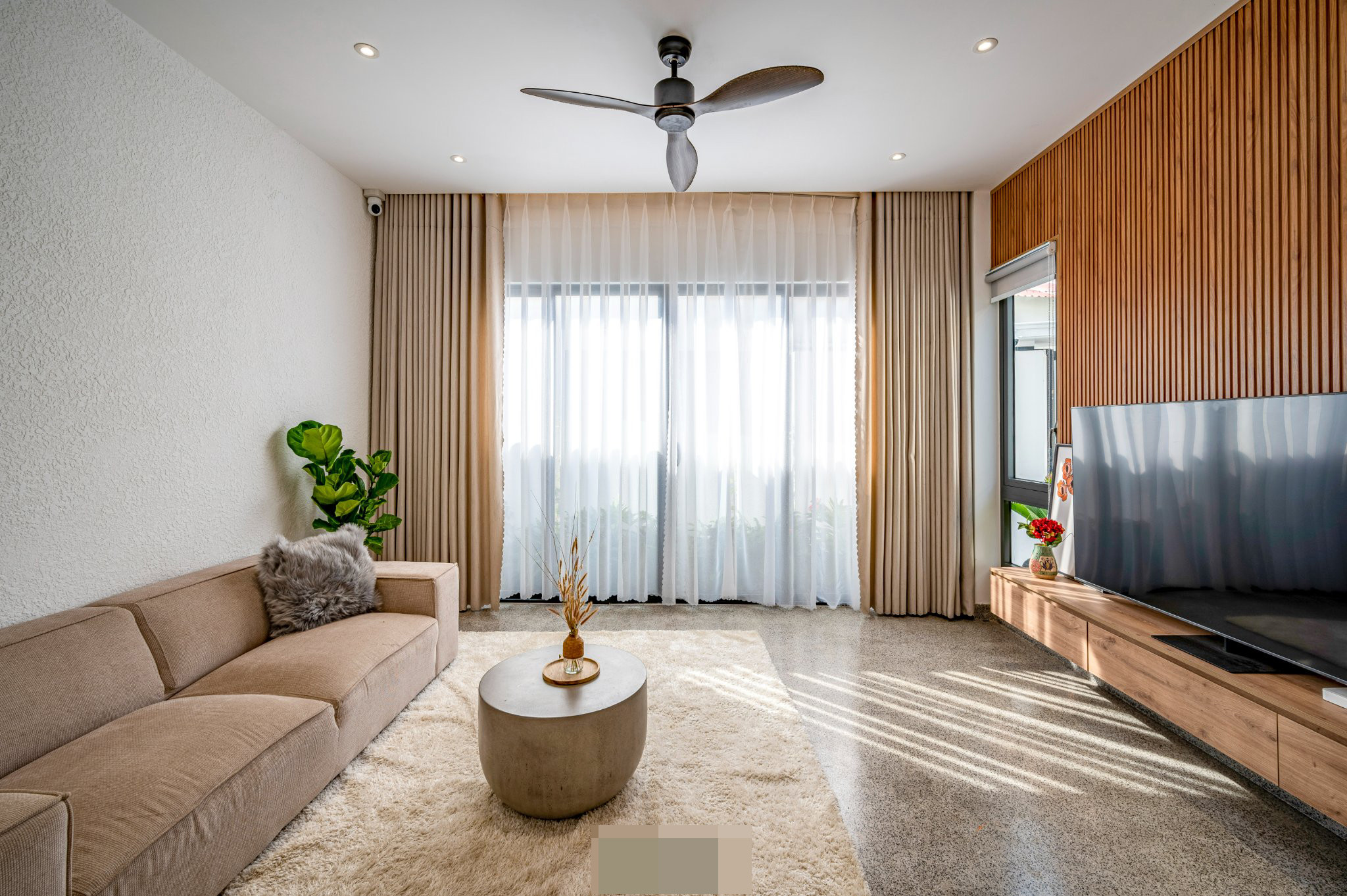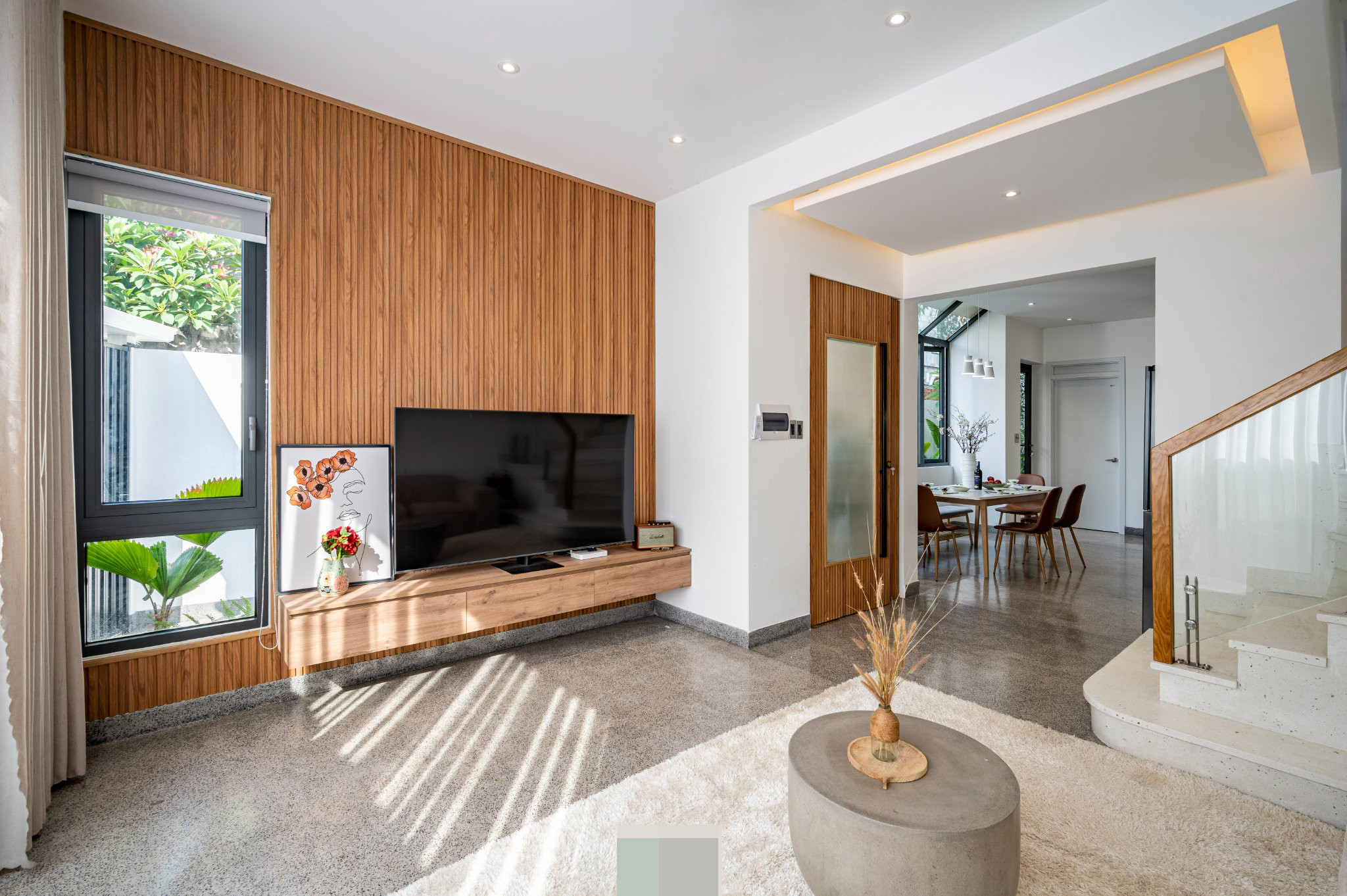 Nội thất phòng khách tối giản, tạo không gian quây quần, đoàn tụ khi cả nhà cùng ngồi xem phim, uống trà.