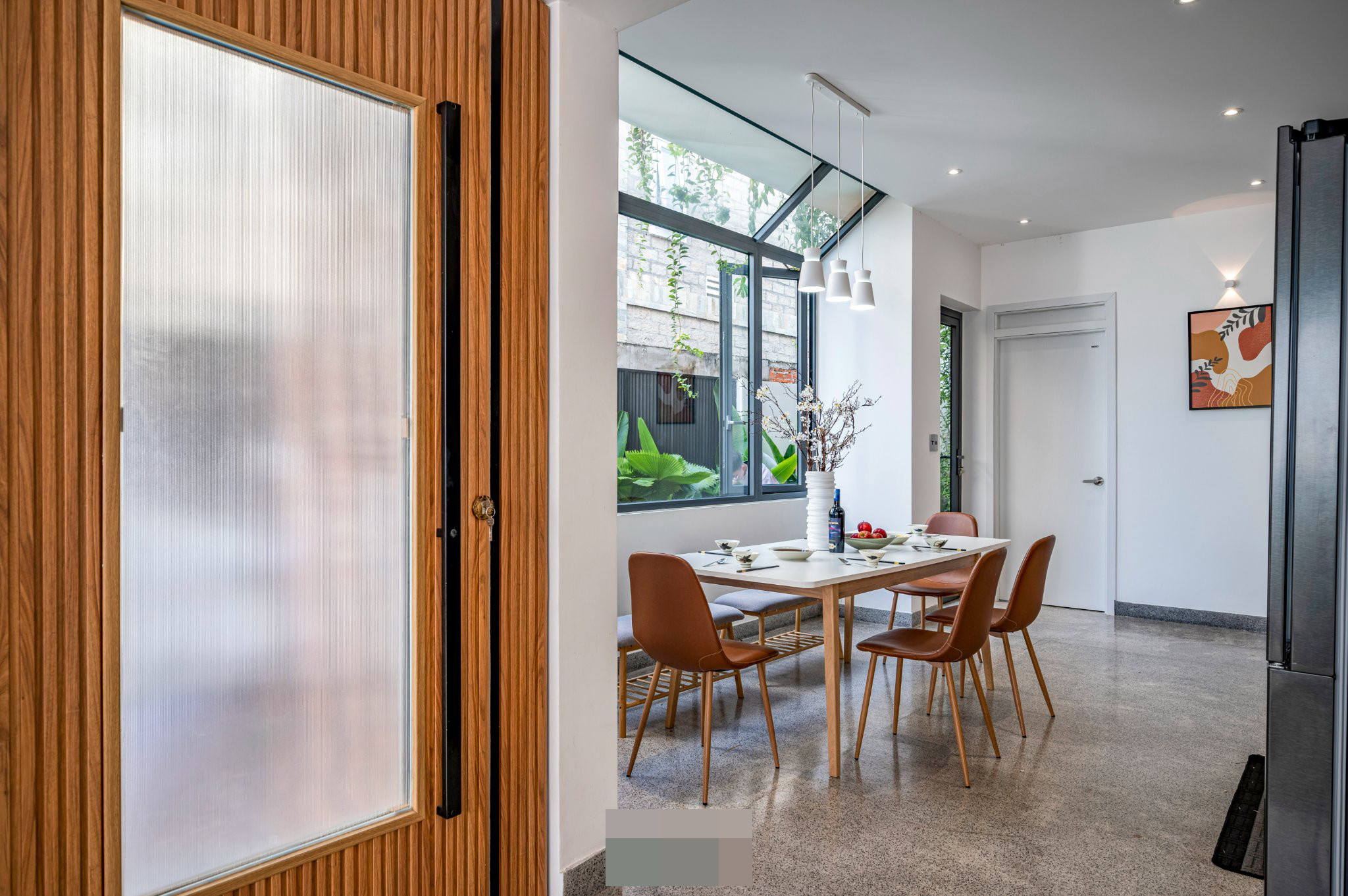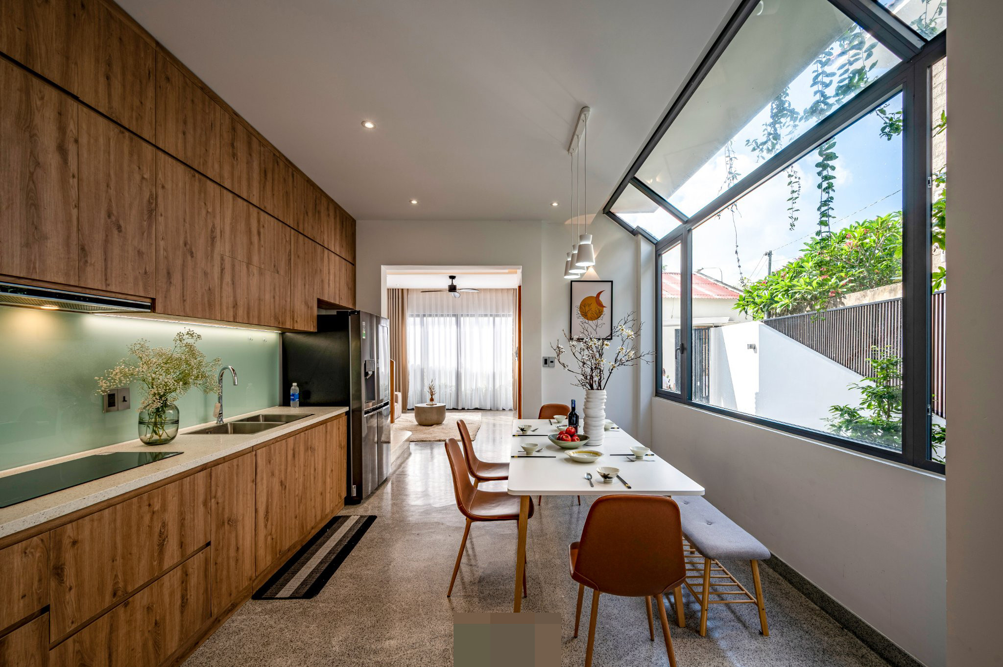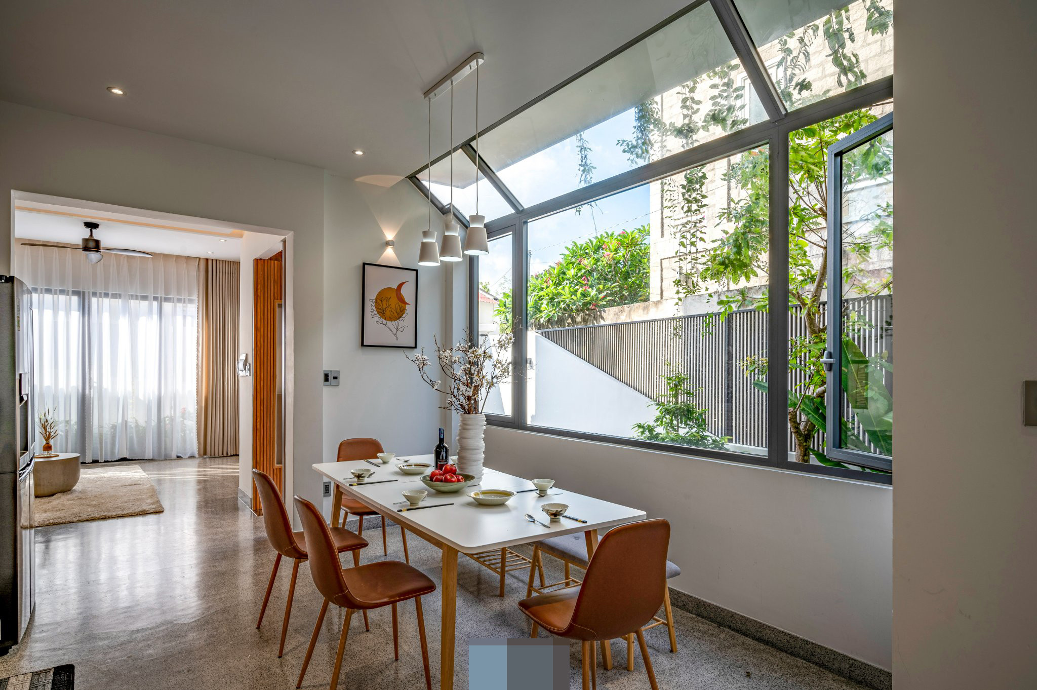 Bếp và bàn ăn bên khung cửa sổ lớn, nhìn ra vườn cây mát mẻ, dễ chịu. Mỗi bữa cơm trôi qua cùng người thân ở đây sẽ thật tuyệt vời.