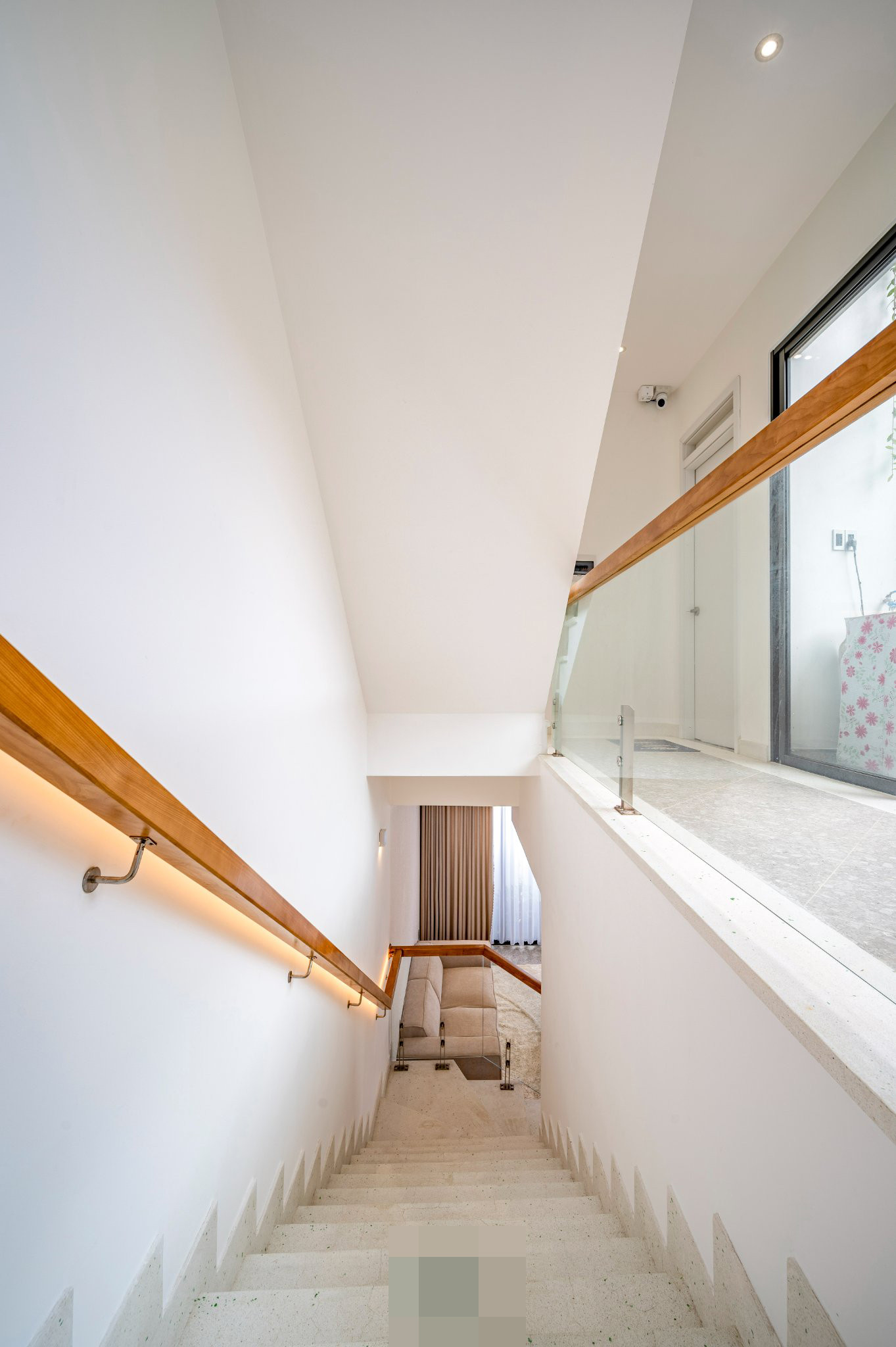 Hệ thống cầu thang được bố trí khá rộng để thuận tiện cho việc di chuyển cho các thành viên trong gia đình. Một số nơi được bố trí thêm đèn vừa trang trí vừa mang lại trải nghiệm sinh hoạt thuận tiện nhất.