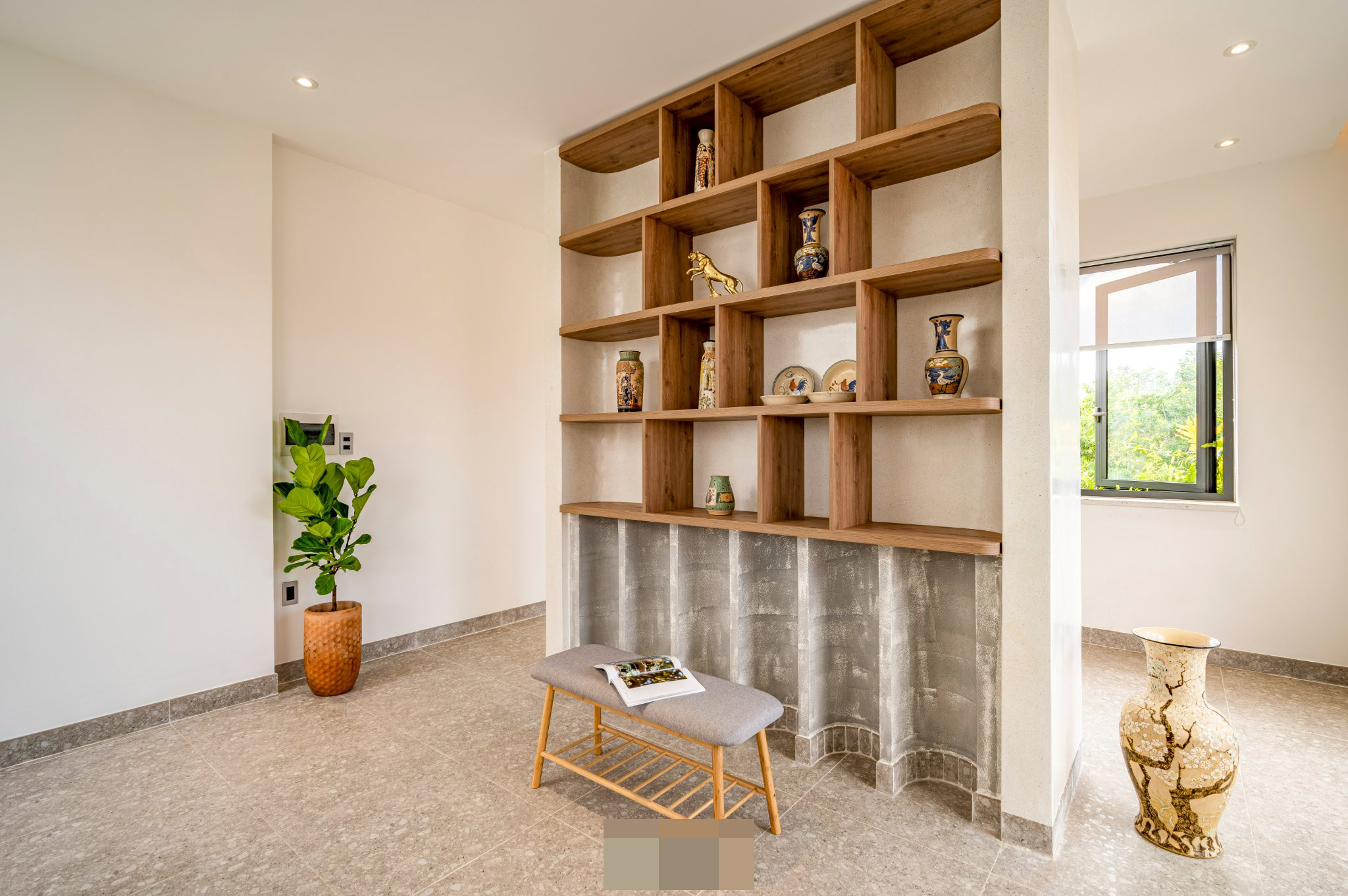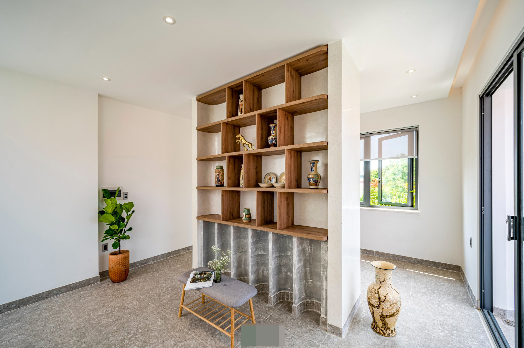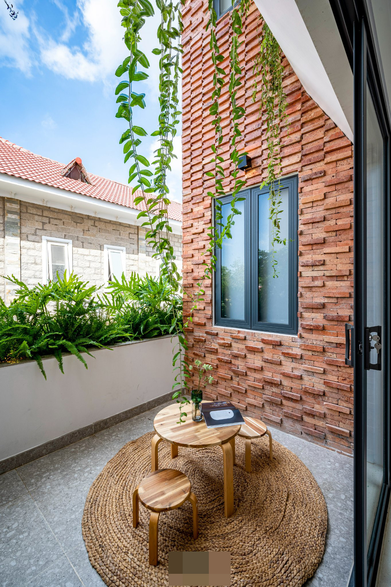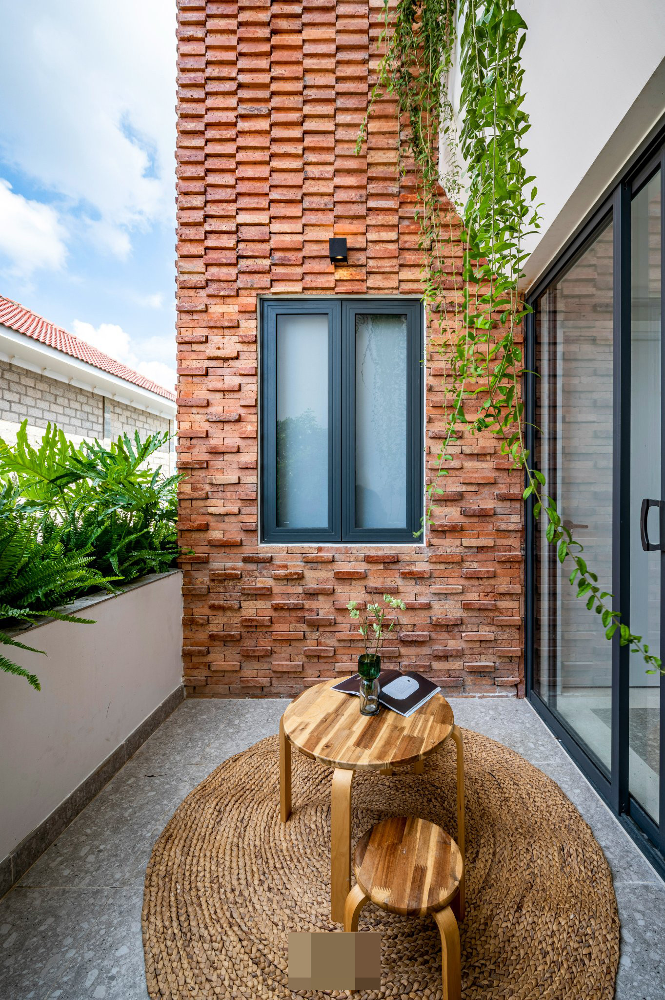 Nét truyền thống thể hiện qua mảng tường gạch nung.
