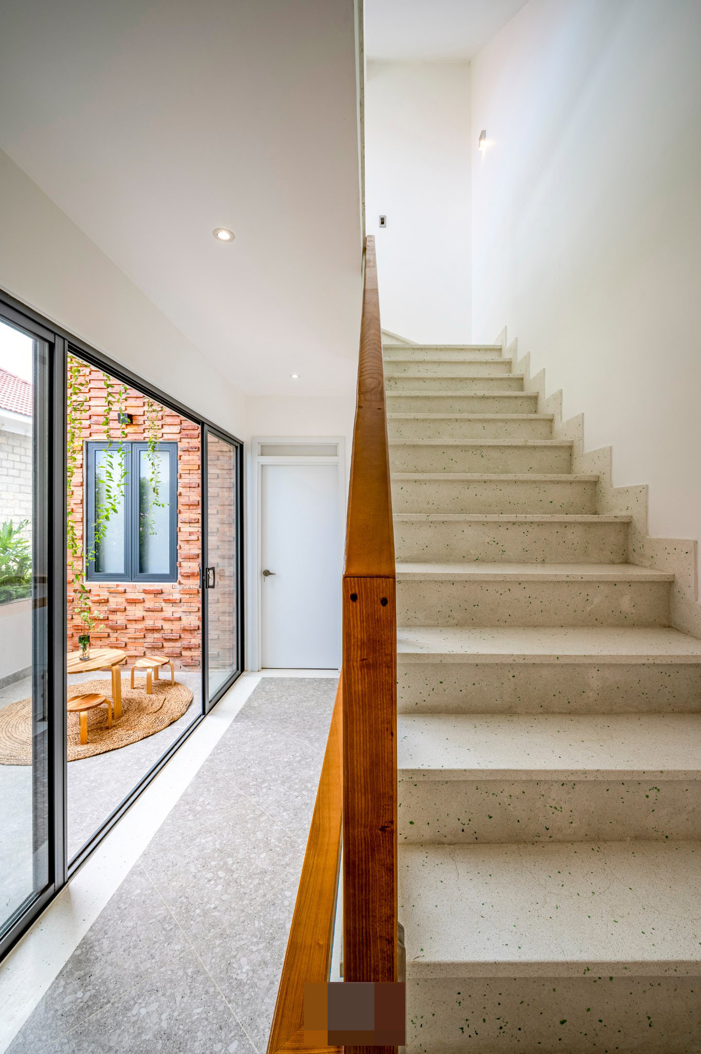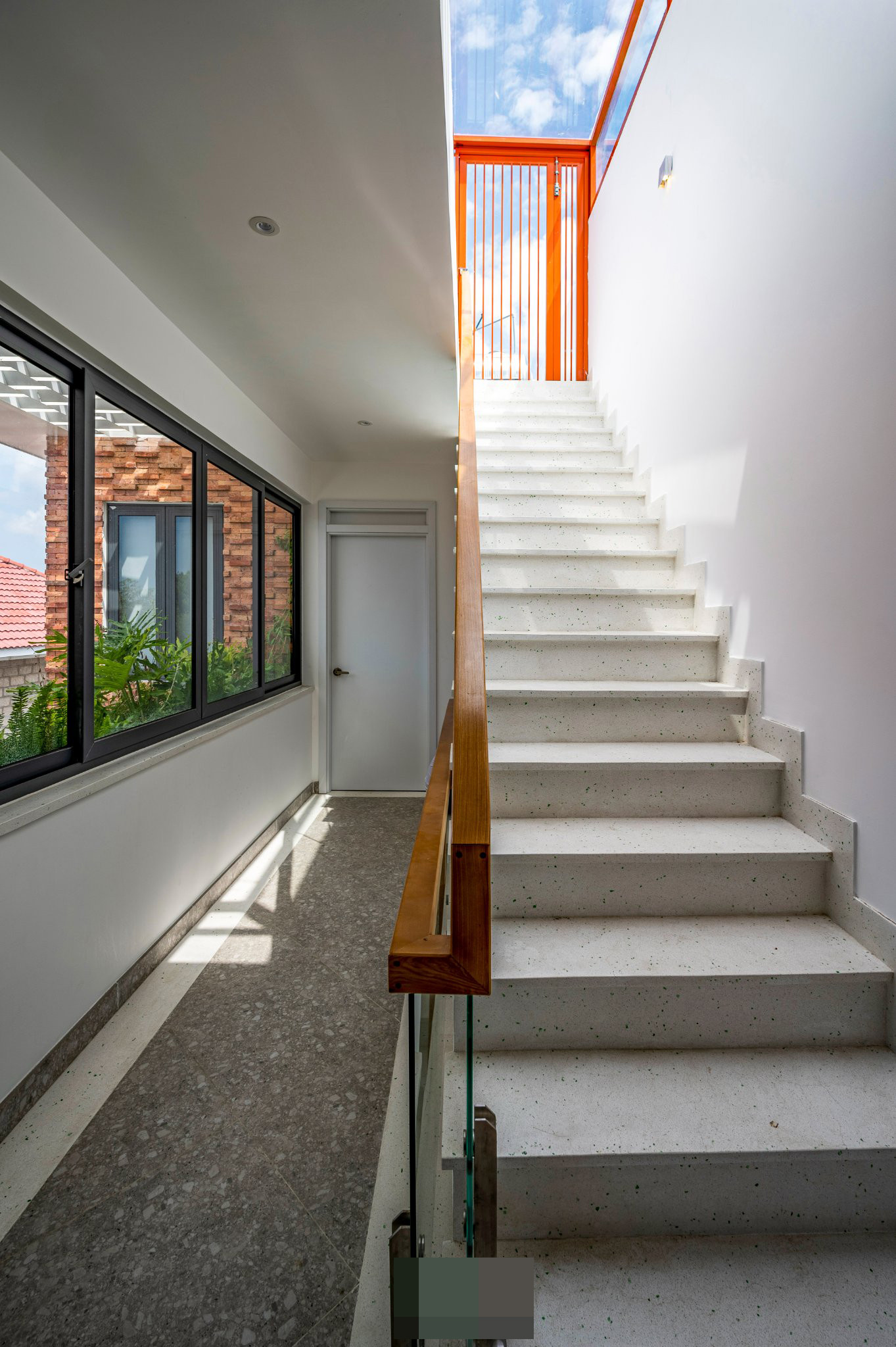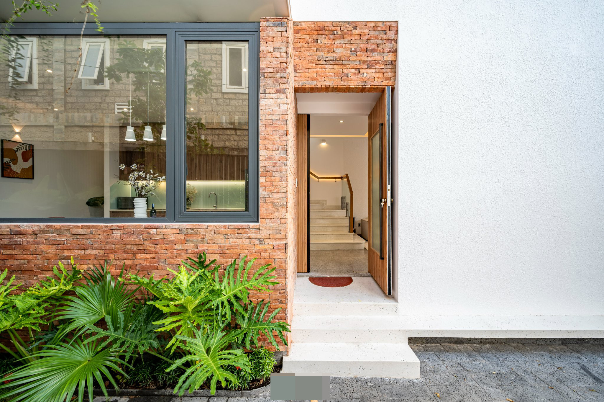 Đặc biệt, để phá bỏ sự vô vị của những bức tường bình thường, nhóm thiết kế sử dụng phun sơn gai hiệu ứng tạo điểm nhấn độc đáo kết hợp với mảng gạch đỏ. Từ một mảnh đất trống nằm trong một con hẻm gần đường chính, ngôi nhà xuất hiện nổi bật giữa khu dân cư xung quanh với gam trắng tinh khôi cùng màu đỏ gạch nung hoài cổ.