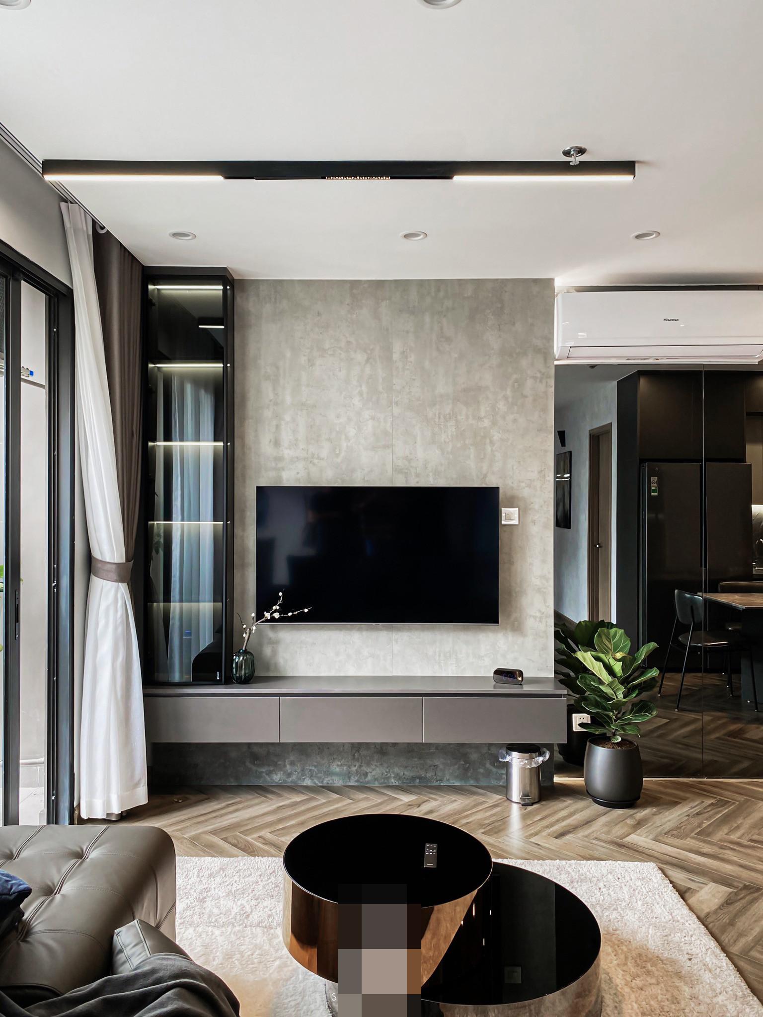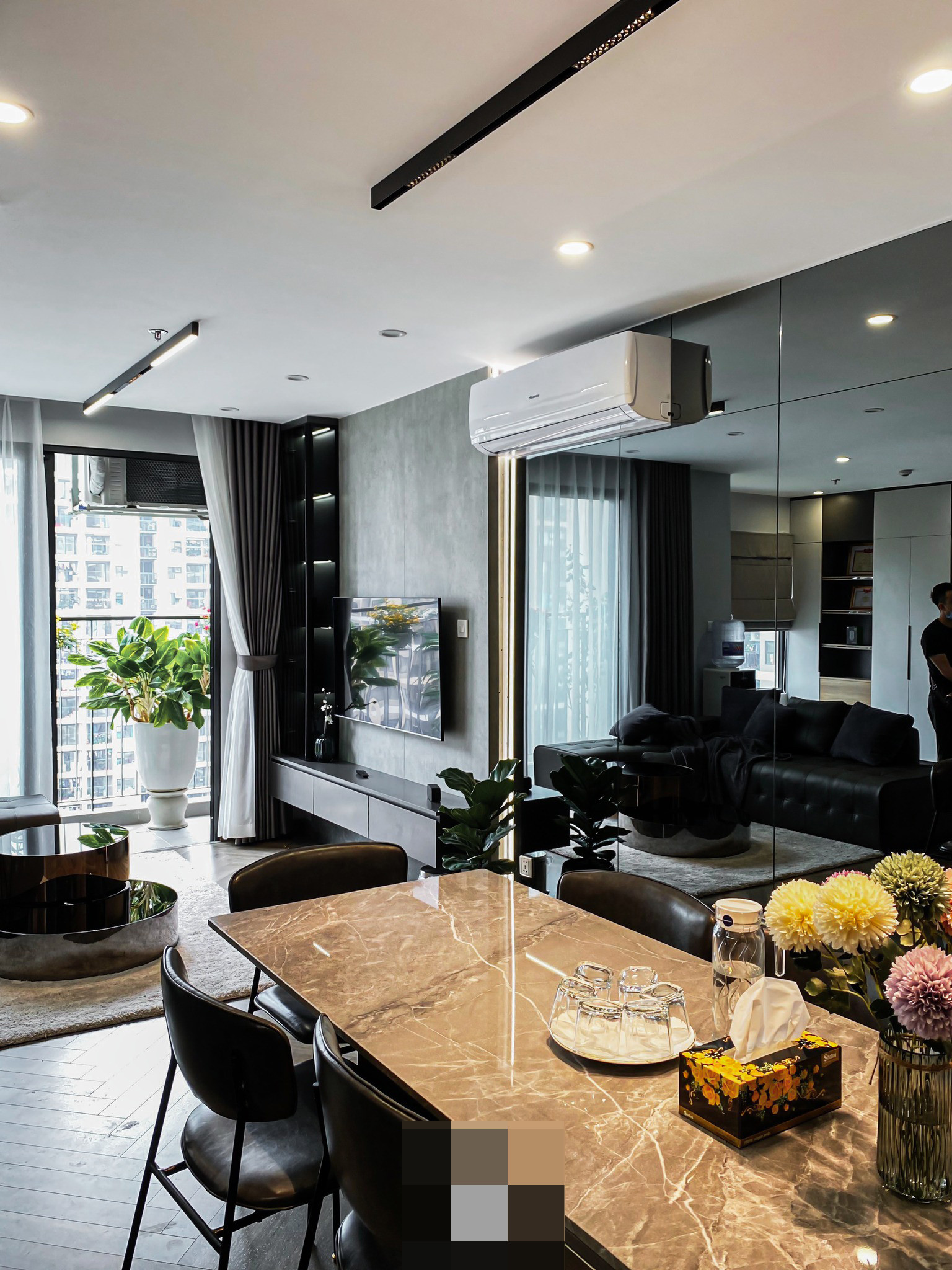 Căn hộ 83m2 ở Hà Nội là tổ ấm đầu tiên của chàng trai 25 tuổi sở hữu. Gia chủ mệnh thủy nên kiến trúc sư đã dùng màu đen và xám trung tính kết hợp phong cách hiện đại, tạo nên không gian sống trẻ trung, tinh tế.
