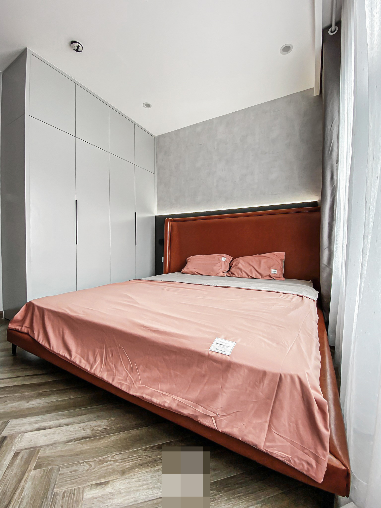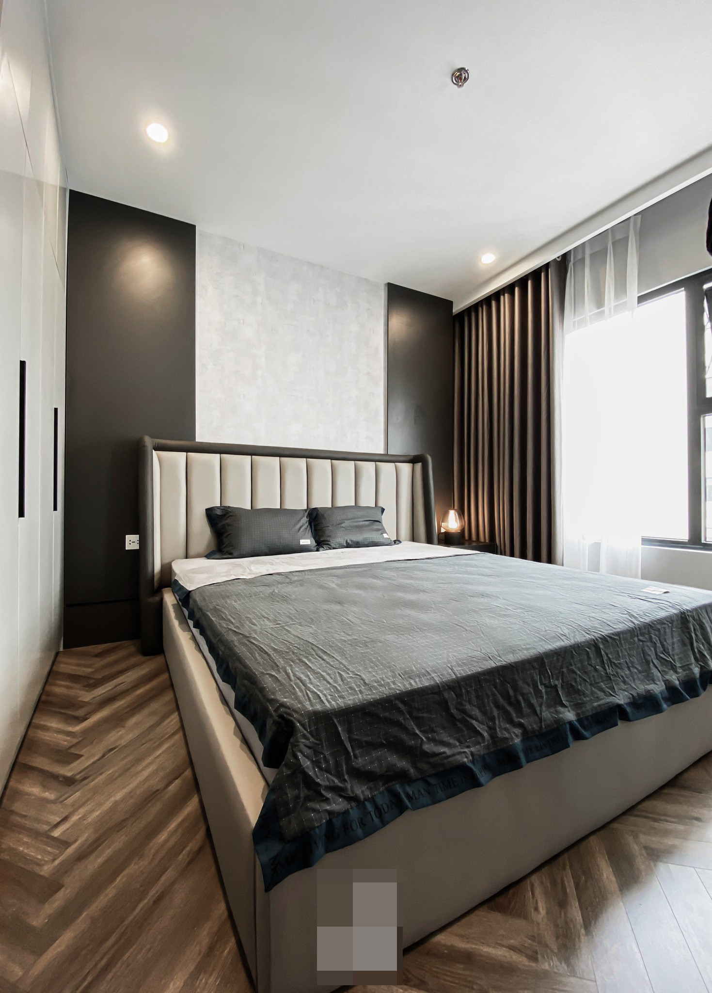 Công trình do các kiến trúc sư Hưng Nguyễn, Phan Cường và kỹ sư Thế Nguyễn thực hiện. Đá bếp và bàn đảo dùng đá tự nhiên xám vân ý. Đá này ưu điểm là đẹp, còn nhược điểm là chống thấm không tốt và dễ nứt.Thiết kế ban đầu của căn hộ có 3 phòng ngủ 2 phòng vệ sinh nhưng sau khi lắng nghe yêu cầu của khách hàng muốn có 1 không gian thoáng đãng để làm việc và thư giãn thì nhóm thiết kế đã cải tạo lại thành 2 ngủ và 1 phòng làm việc.Vật liệu sử dụng trong căn hộ là MDF chống ẩm của An Cường.Do phòng khách là sàn gạch còn phòng ngủ là sàn gỗ nên đội ngũ thi công phải dỡ hết sàn gạch và sàn gỗ cũ để lát lại toàn bộ sàn gỗ mới, nhằm đảm bảo tính thẩm mỹ và đồng bộ. Sau một tháng thi công, nhóm thiết kế đã hoàn thiện được sản phẩm, đạt được sự hài lòng tối đa của gia chủ.Khu vực làm việc được cải tạo từ phòng ngủ, đập bức tường ngăn để tạo một không gian mở thoáng đãng. Đường nét thiết kế, đồ nội thất, decor thể hiện cá tính của gia chủ.