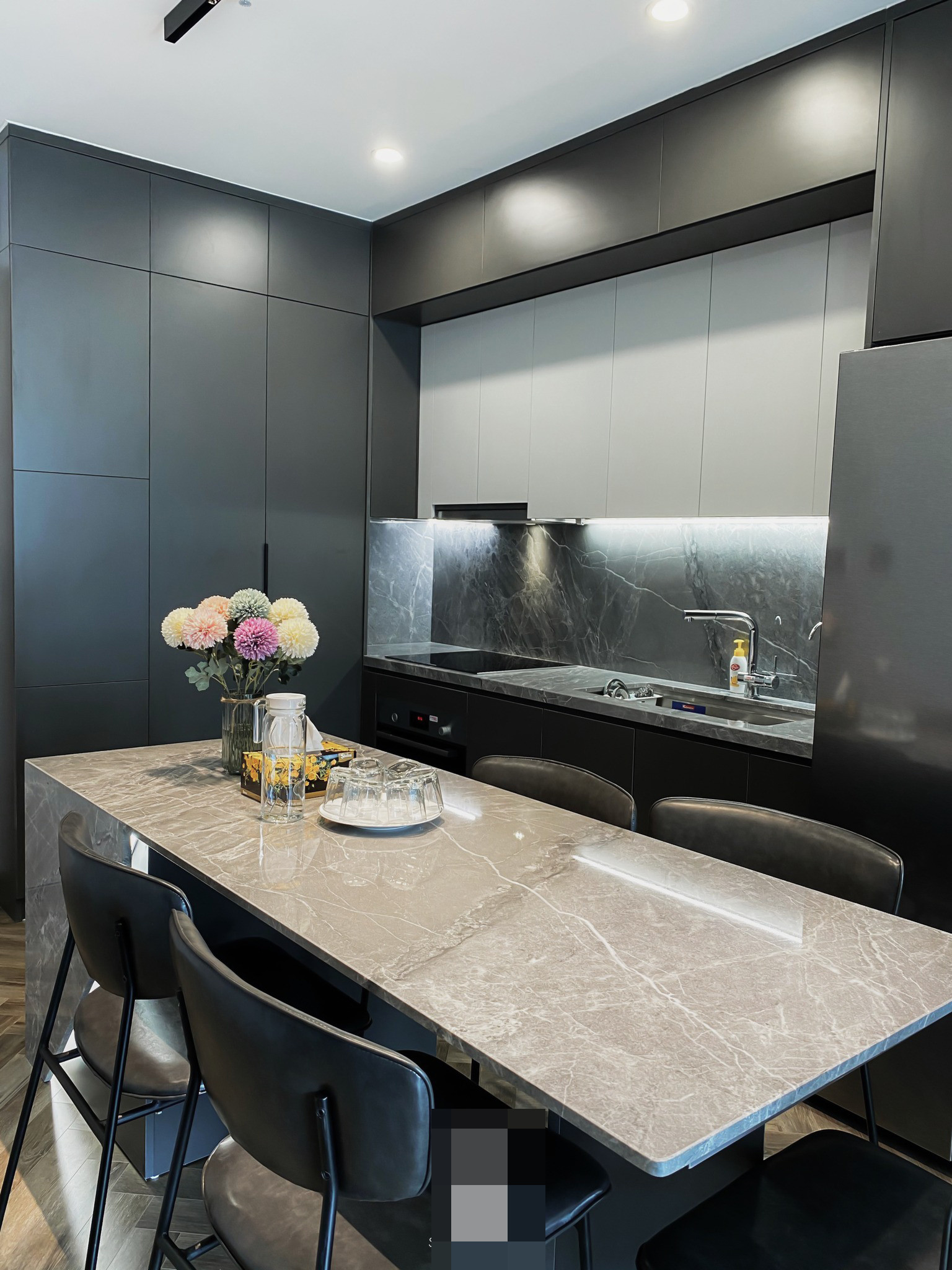 Gia chủ mệnh thủy nên tông màu chủ đạo của căn nhà là màu đen và màu ghi trung tính. Hai tông màu này khi kết hợp với nhau vừa toát lên sự hiện đại trẻ trung nhưng cũng không kém phần sang trọng.