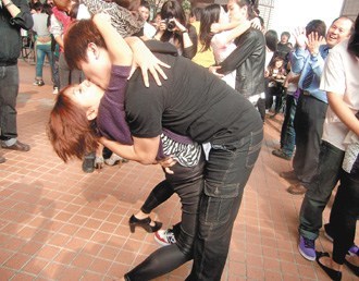 Đặc biệt, cuộc thi hôn này còn có sự tham dự của hai học viên già tuổi nhất là Lâm Dũng Trí (76 tuổi) và bà Lâm Mỹ Nga (64 tuổi). “Tiếc là hôm nay tôi chưa nạp điện” – Ông Lâm nói đùa và cho biết đây là lần đầu tiên ông hôn trước đông người như vậy.