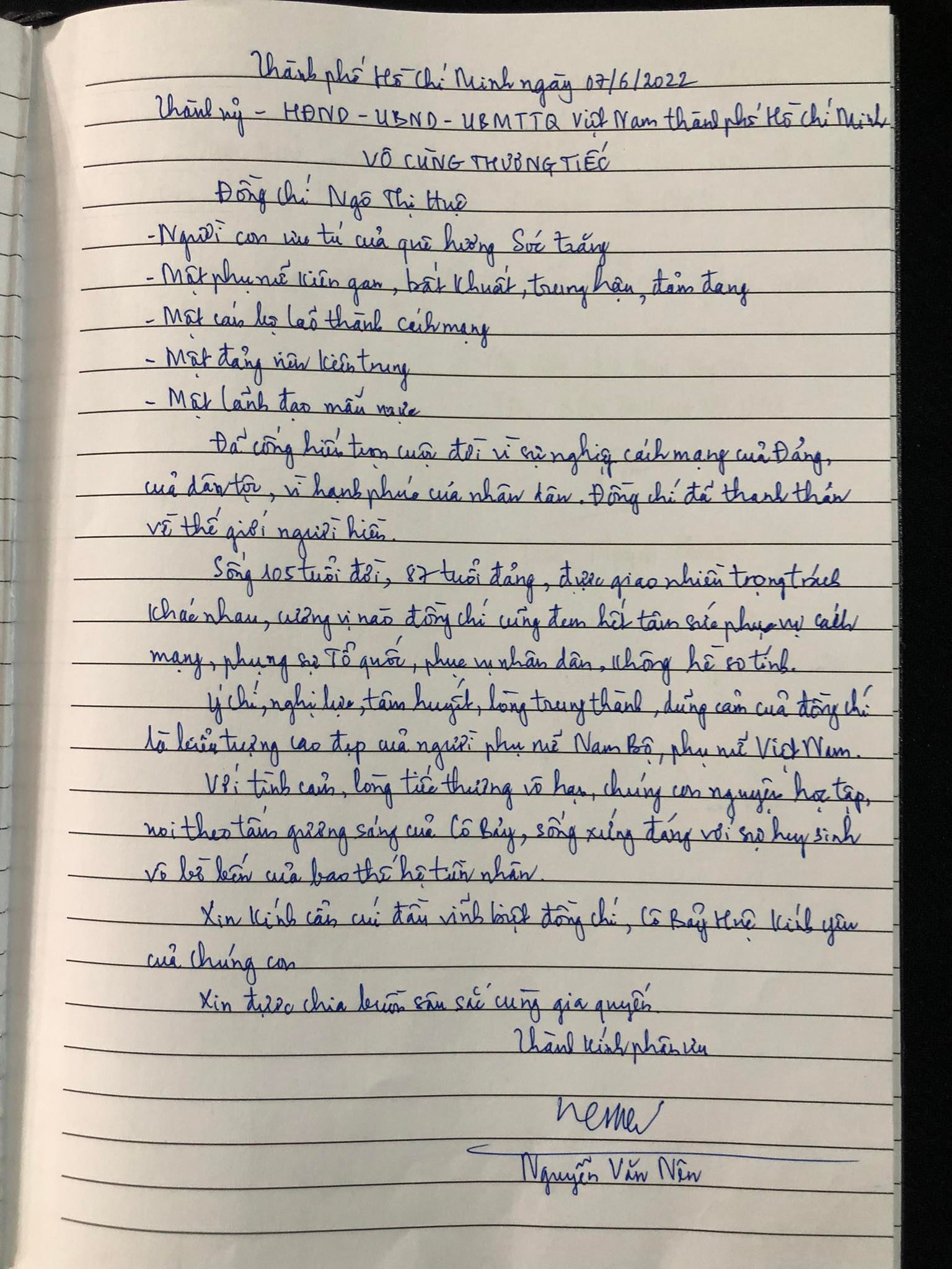 Ghi sổ tang, ông Nguyễn Văn Nên nêu rõ: “Ban Bí thư vô cùng thương tiếc đồng chí Nguyễn Thị Ngỡi (Ngô Thị Huệ), Bà Bảy Huệ, Bác Bảy Huệ, Cô Bảy Huệ kính mến, người con ưu tú của quê hương Sóc Trăng, cán bộ lão thành cách mạng, người cộng sản kiên trung, bất khuất, suốt đời phấn đấu vì lý tưởng cách mạng, vì độc lập dân tộc, vì hạnh phúc nhân dân, đã vĩnh viễn ra đi.