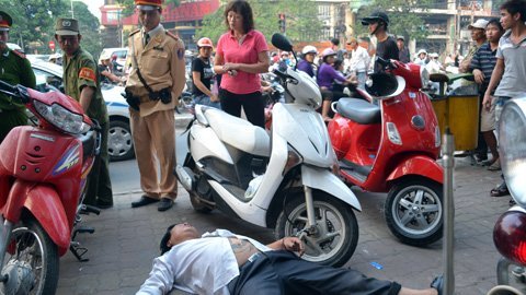 | Ma men Phạm Văn Đông luồn tay vào bánh xe Honda Lead của mình rồi nằm xuống đất để ... ăn vạ! |