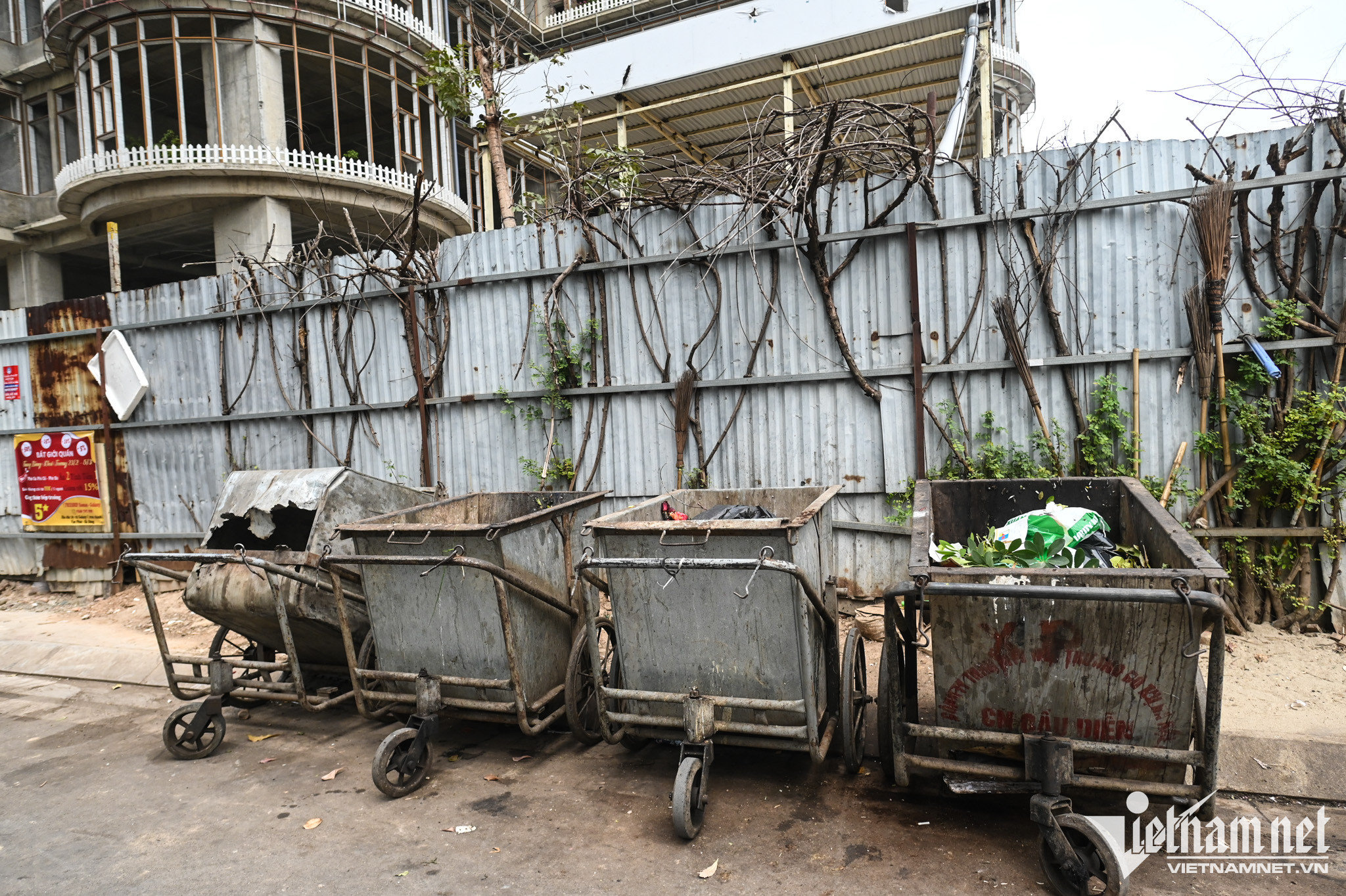 Ngay phía rào chắn, nhiều xe rác được tập kết khiến quang cảnh khá nhếch nhác.