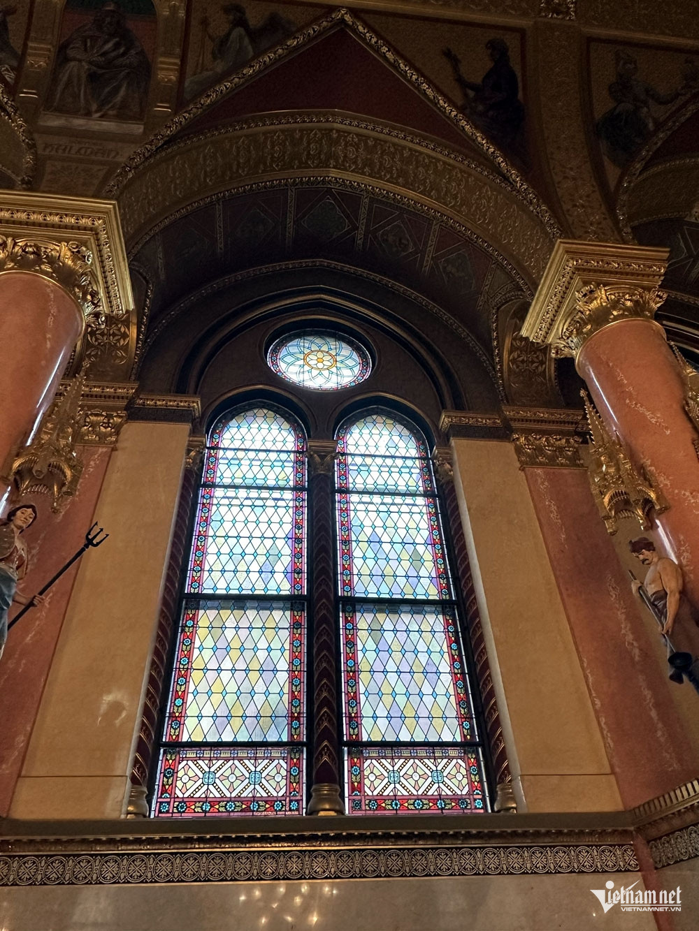 Một trong những điều làm nên vẻ đẹp đặc biệt của tòa nhà Quốc hội Hungary chính là cách nó tương tác với ánh sáng. Vào ban ngày, ánh sáng mặt trời chiếu qua các ô cửa kính màu tạo nên hiệu ứng lung linh như những bức tranh ghép.