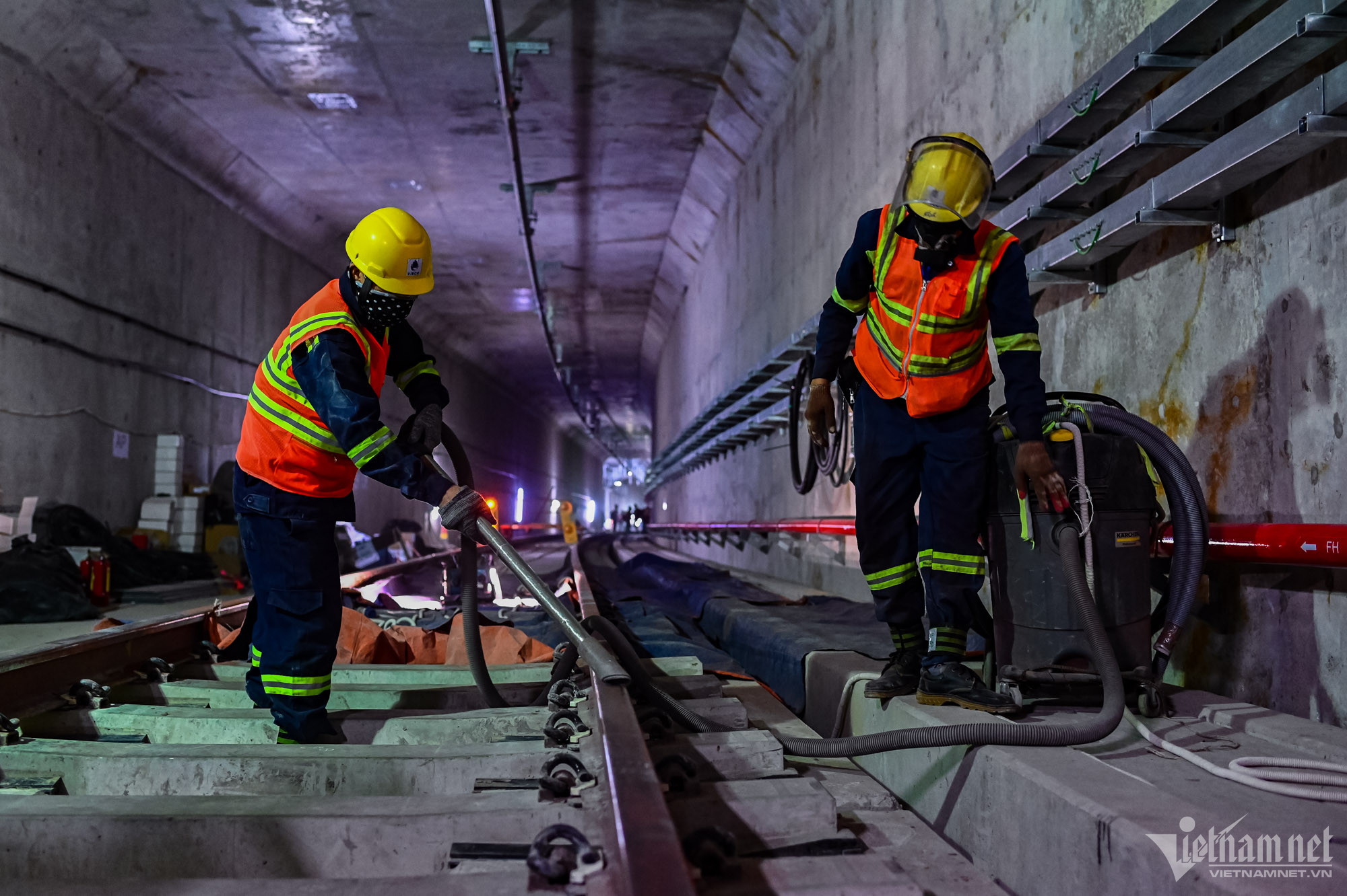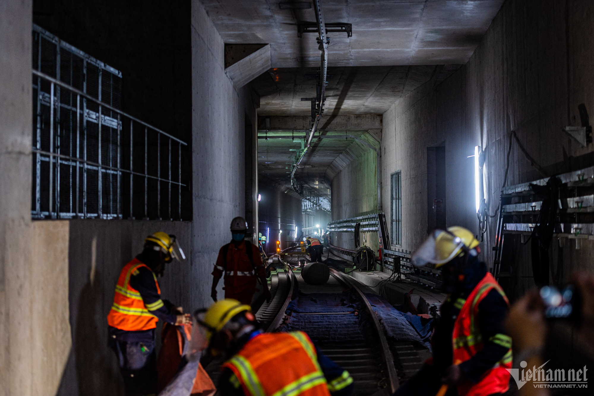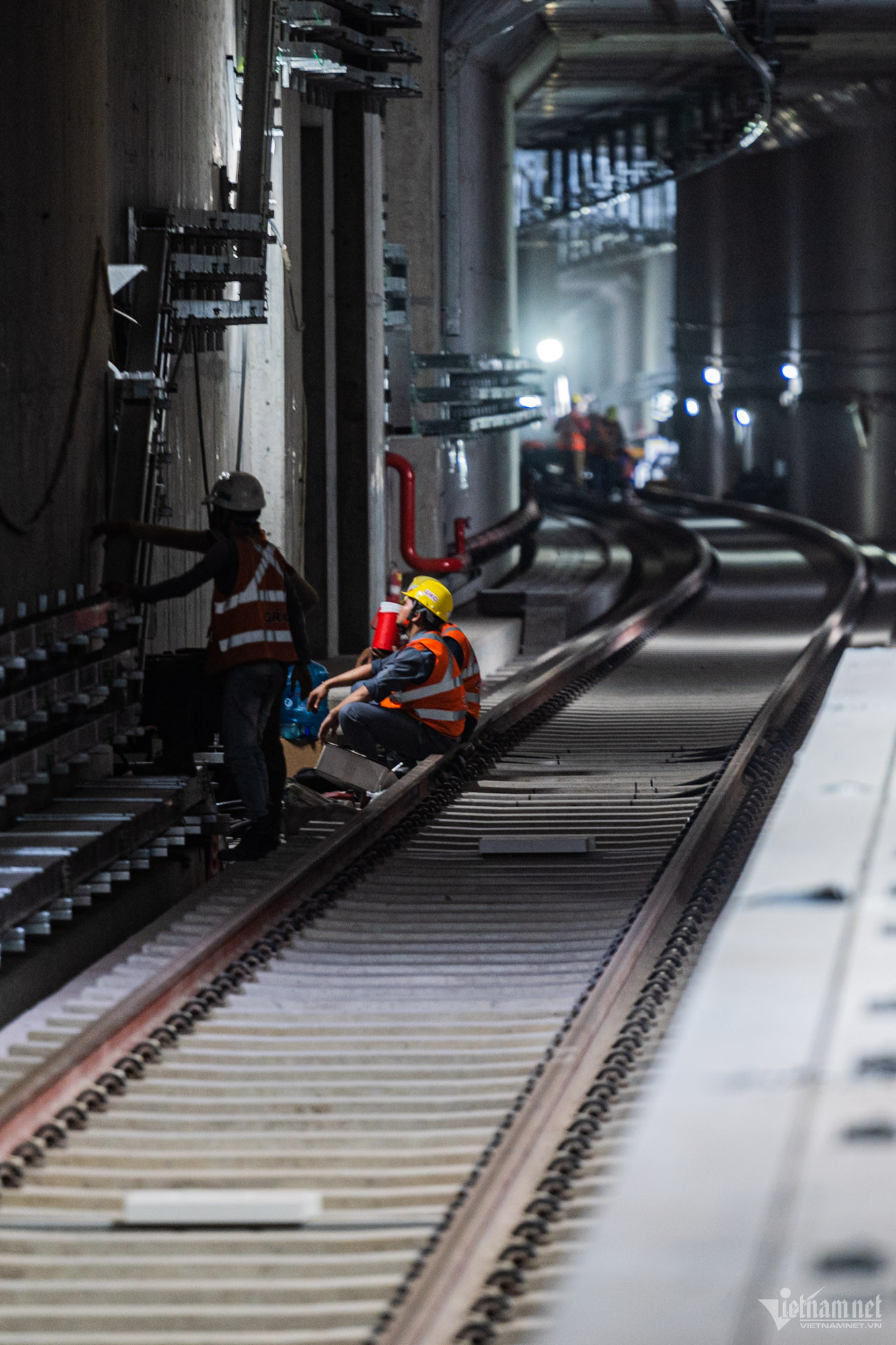 Công nhân tất bật làm việc khu vực đường ray ngầm nối ga trung tâm Bến Thành với các ga Ba Son, ga Nhà hát Thành phố.