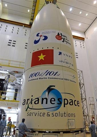 | Lắp ráp VINASAT-2 và hệ thống điểu khiển phóng vệ tinh kép vào phần đầu tên lửa Ariane 5 đã in sẵn quốc kỳ Việt Nam. |