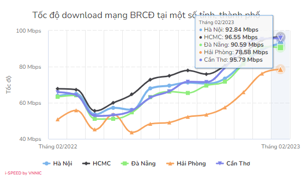 Cụ thể, tốc độ tải xuống trung bình của mạng băng rộng cố định tại Việt Nam tháng 2/2023 là 89,73 Mbps (tăng 4,6% so với tháng 1).
