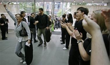 Chờ đợi: Hơn 100 người kiên nhẫn ngồi chờ gần một logo Apple trước giờ iPhone "khai cuộc" tại San Francisco, California vào sáng sớm ngày 29/6. Ảnh: Reuters | Giờ "G" đã điểm: sau những ngày dài chờ đợi, cuối cùng đã đến 6 giờ tối ngày 29/6, dòng người ồ ạt đổ xô vào một cửa hàng Apple ở Chicago để mua iPhone, đến nỗi các nhân viên phải ra hướng dẫn khách "từ tốn" đi vào. Ảnh: AP |